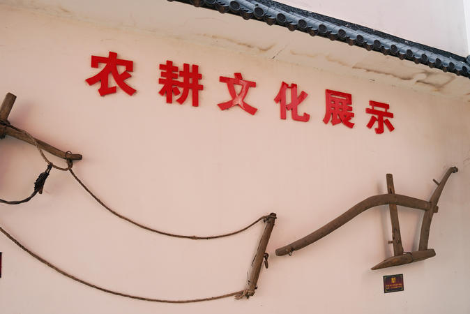 墙面的书画及雕刻品仍在讲述着叶家族人的奋斗史,犁、耙、石磨、煤油灯等,传统农耕农具镶嵌在墙外。