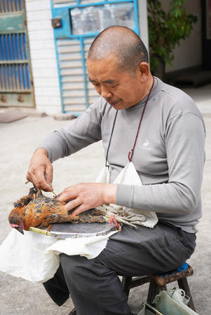 手艺人杨光长,十多岁便习得“线鸡”手艺,随着老手艺人淡出,周围会线鸡活的便只他一人。这是一门季节性的生计,以前需走街串巷,如今农户们将鸡备好提到他家。