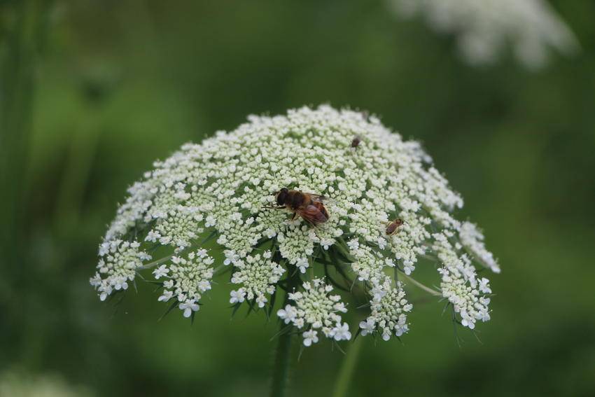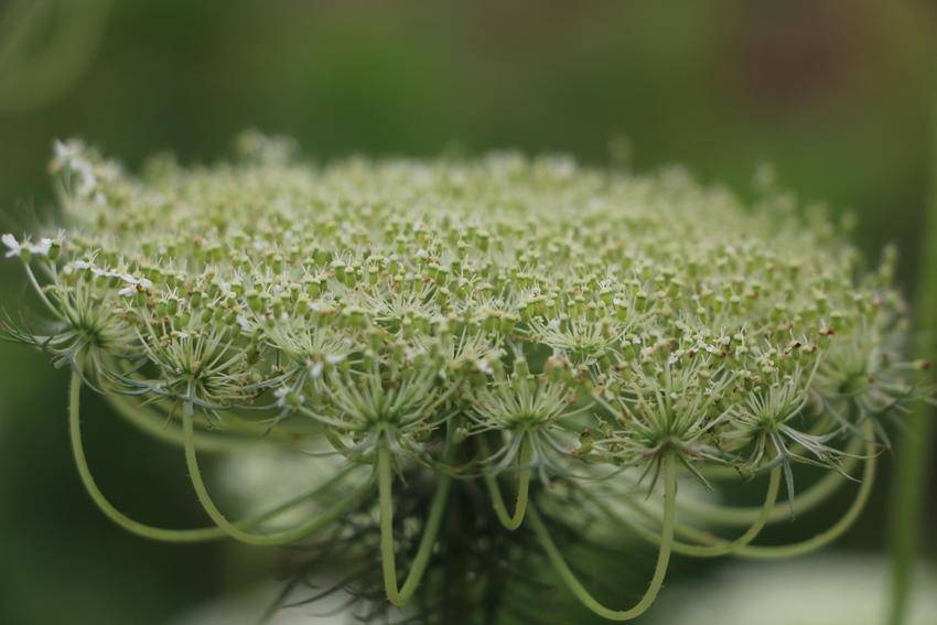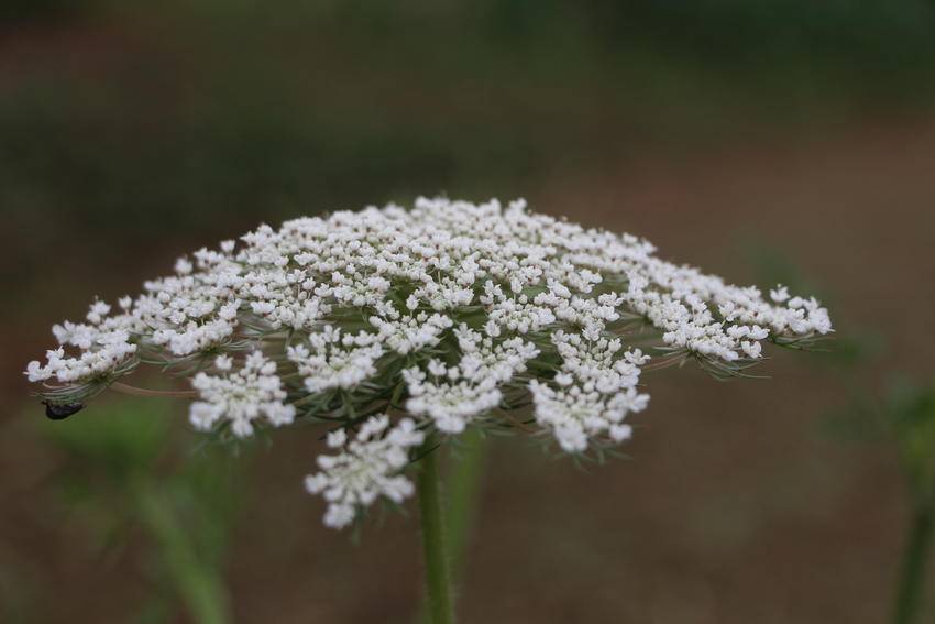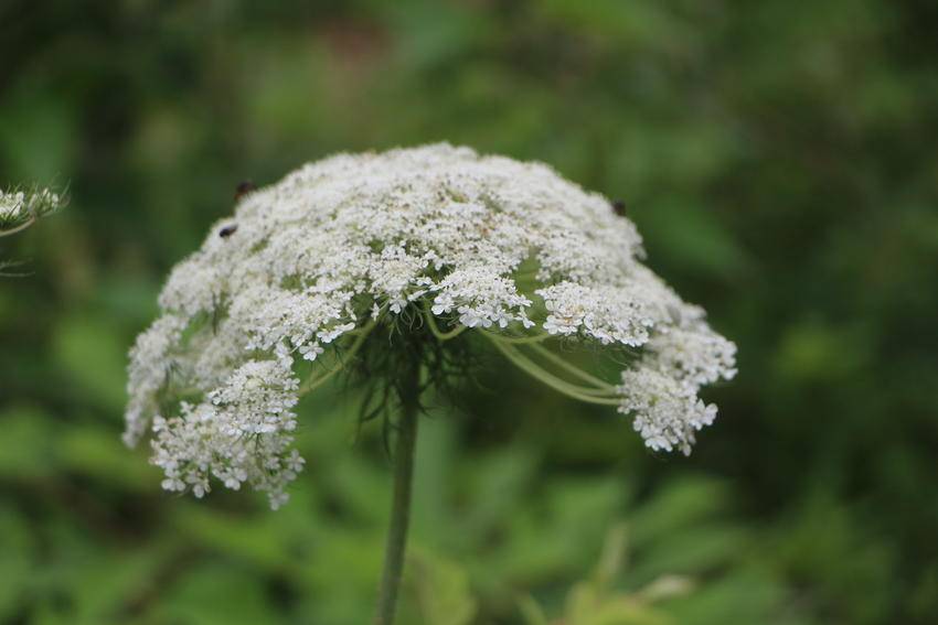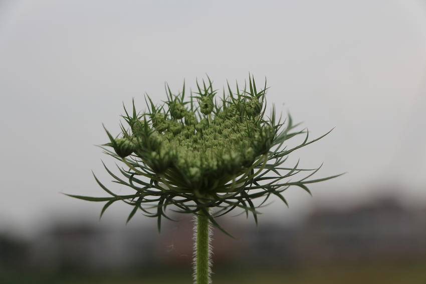 这是一种高约120厘米、茎生白色粗硬毛的绿叶植物。各个分枝头的复伞形花序上开满了细碎的白花,个别花朵谢了的淡绿果实呈圆卵形并向内聚合,其外表多刺毛。薅住一棵连根拔起,闻见一股浓烈的胡萝卜气味,品尝其香菜根样的根皮,先甜后苦。