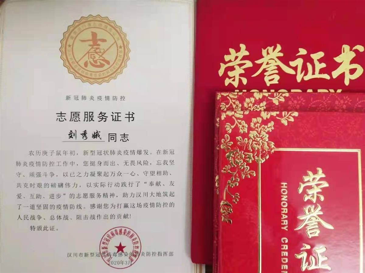 2020年3月,刘秀娥作为优秀志愿者受到汉川市新冠肺炎疫情防控指挥部表彰。