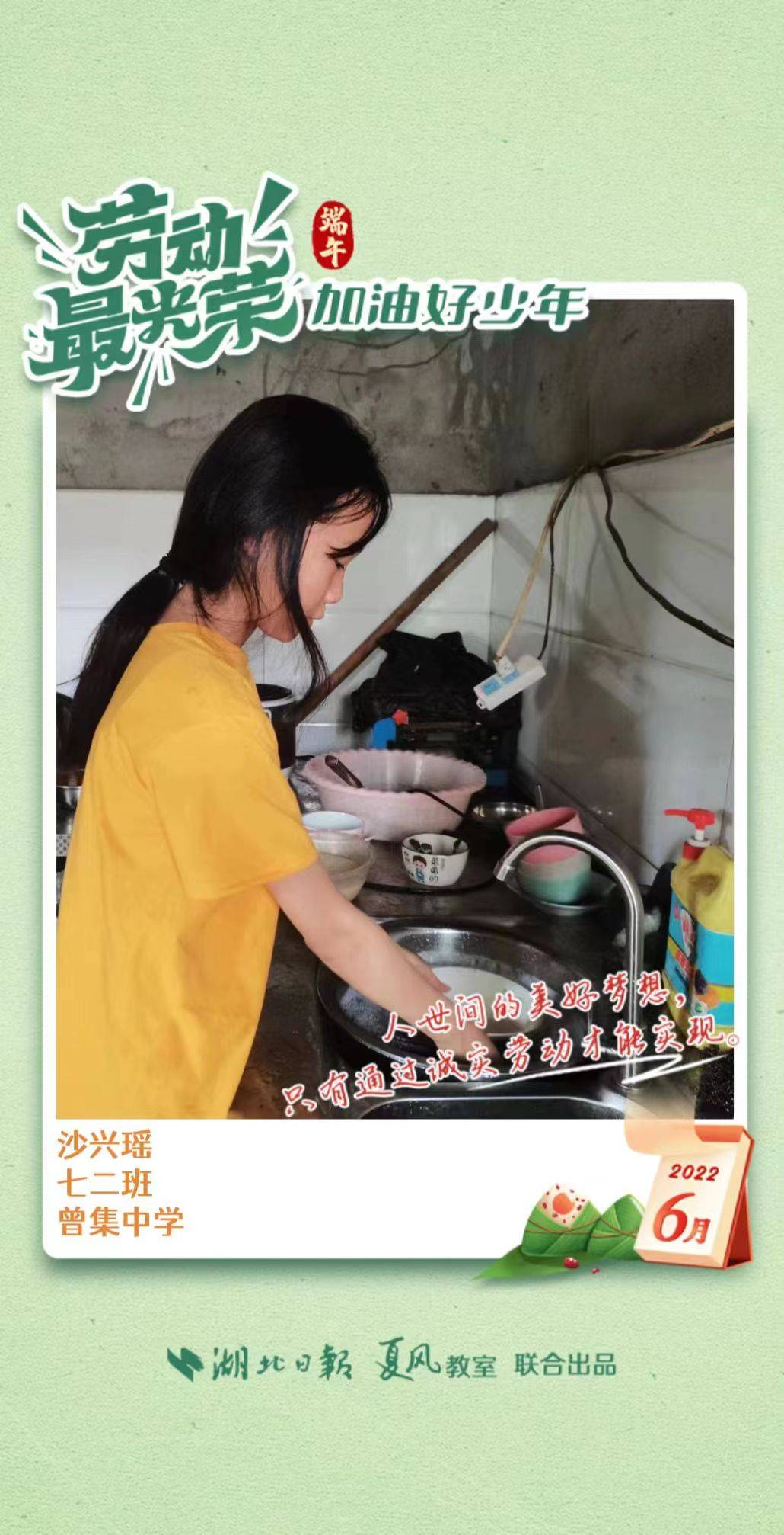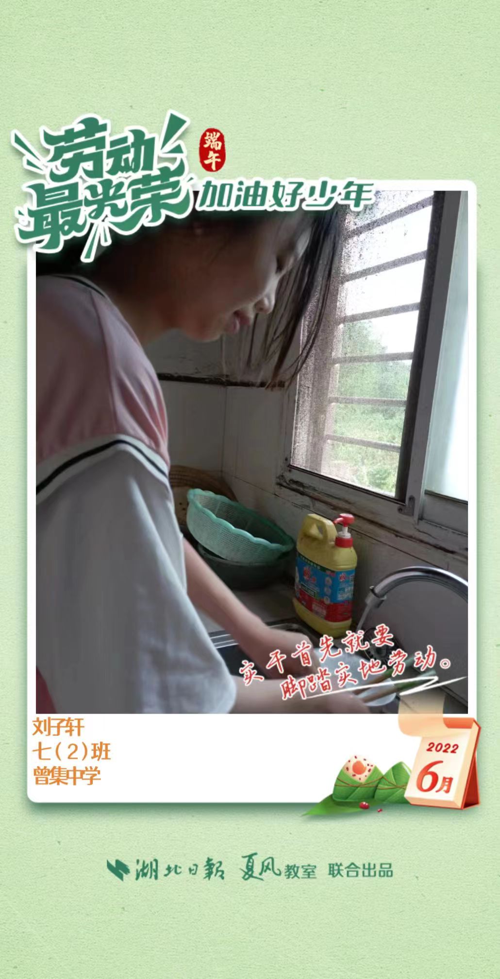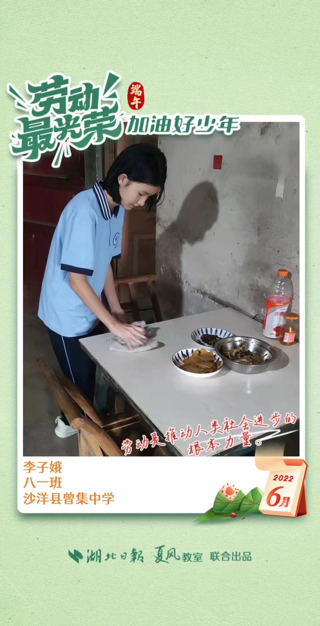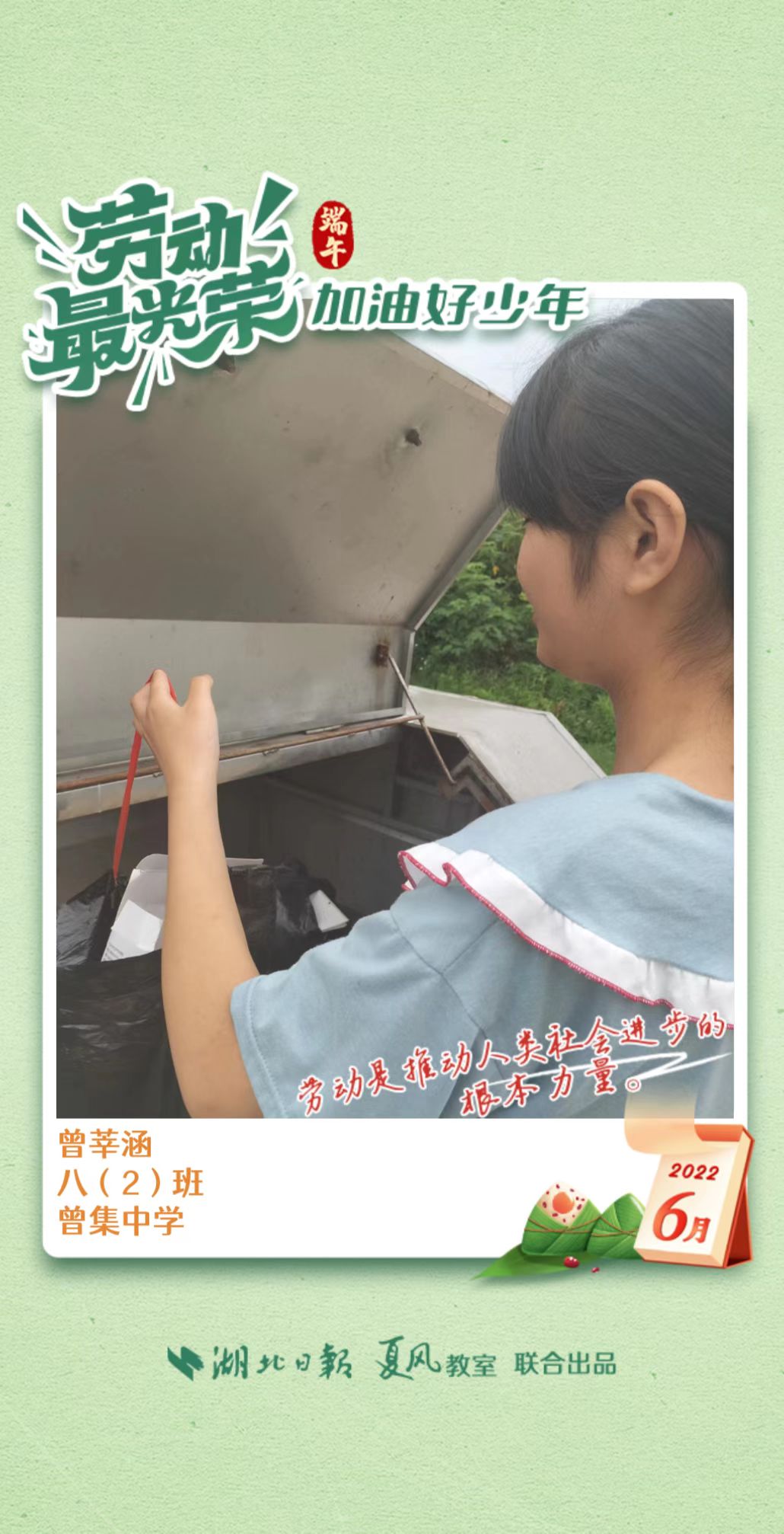 3、填写学生信息,自愿上传学生劳动照片即可,一键生成有“湖北日报”落款的个人专属海报,长按图片下载保存。