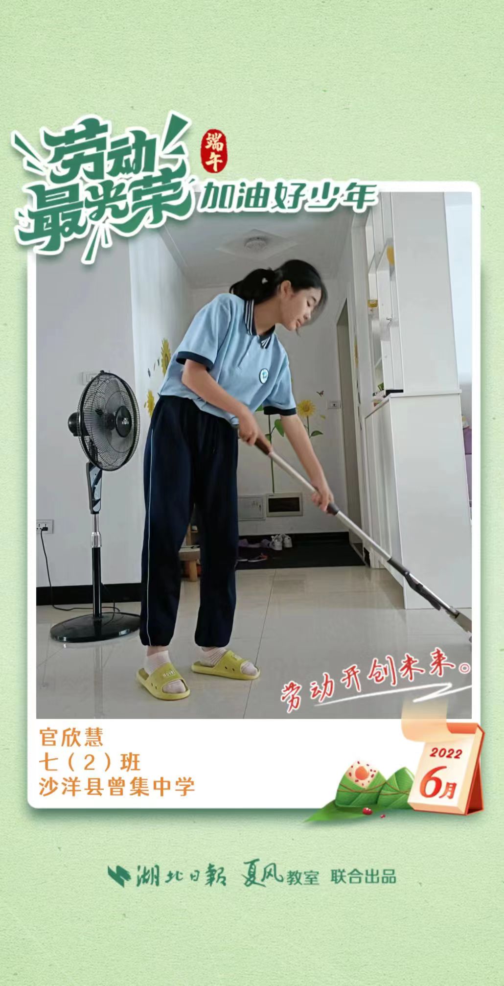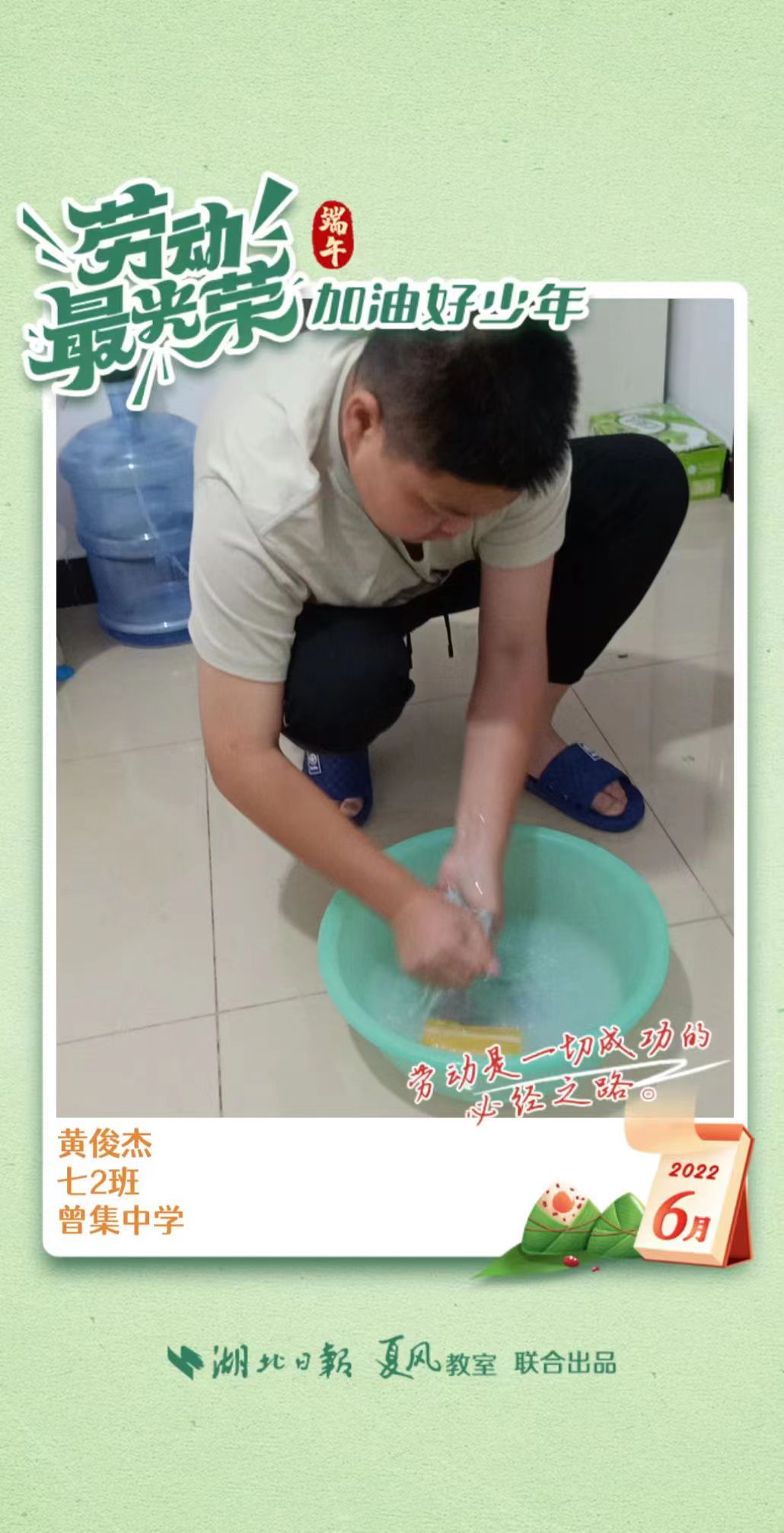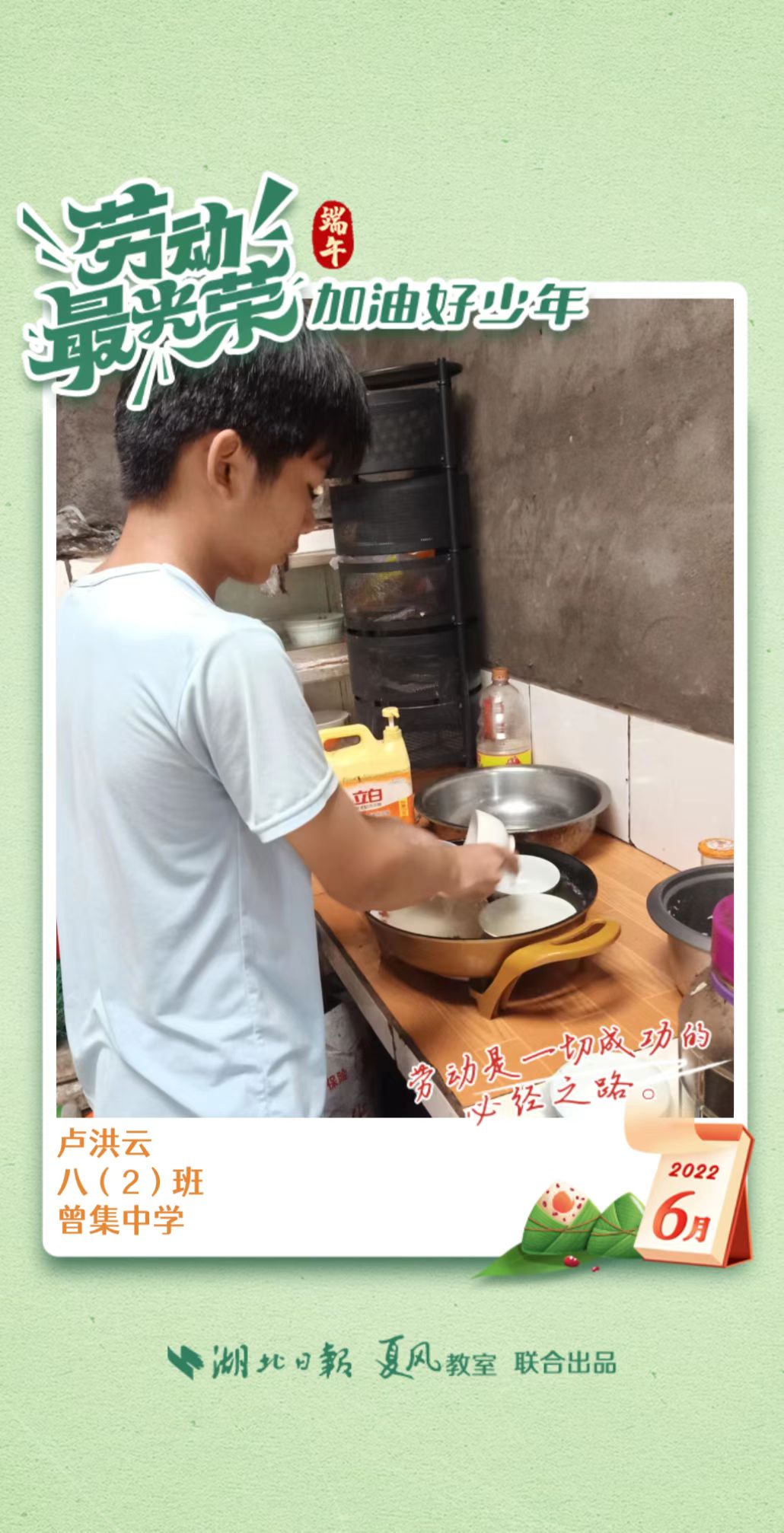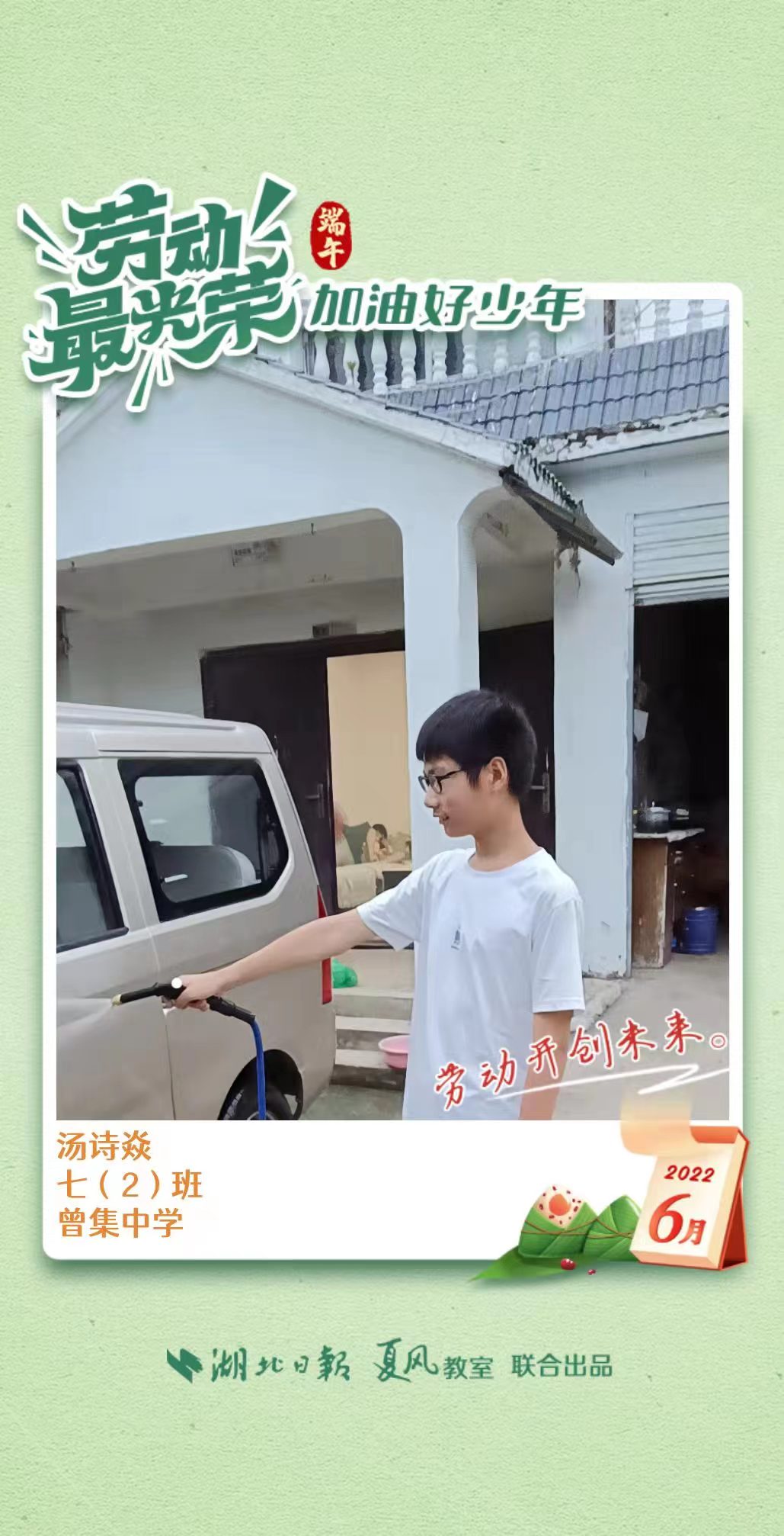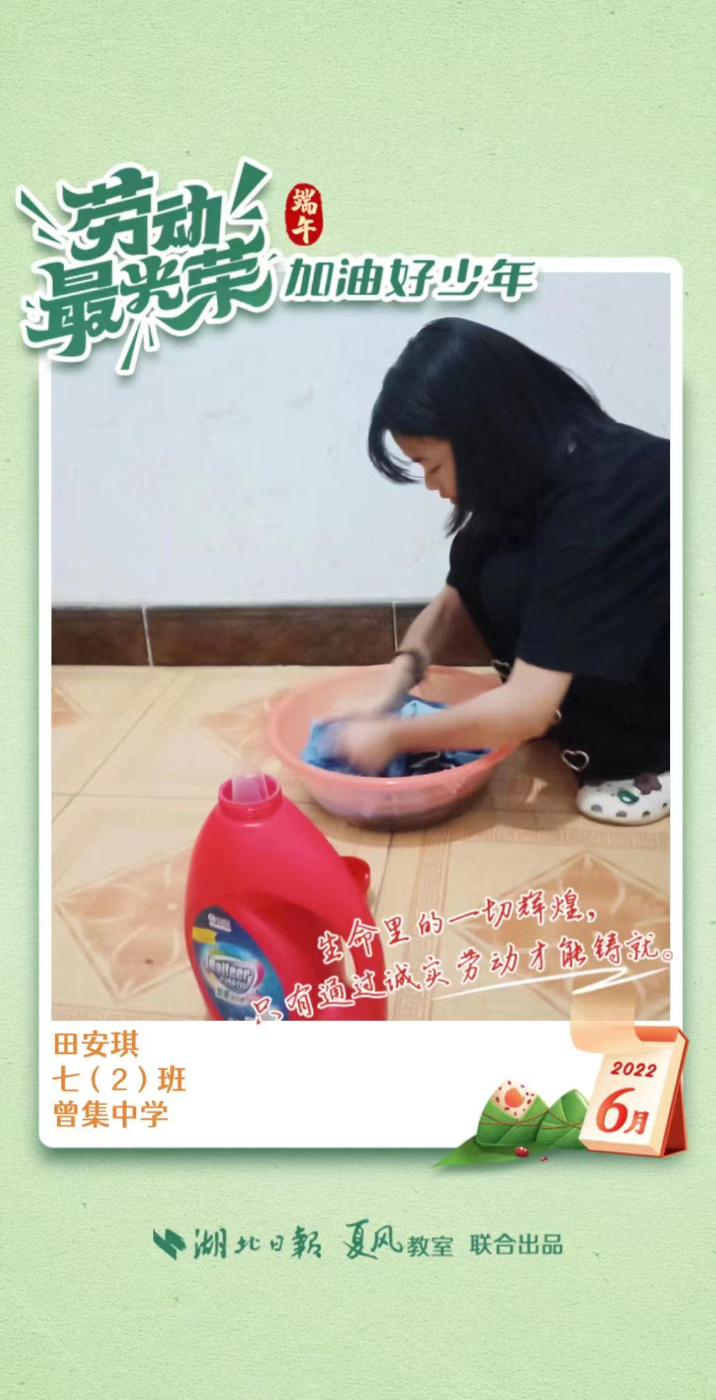3、填写学生信息,自愿上传学生劳动照片即可,一键生成有“湖北日报”落款的个人专属海报,长按图片下载保存。