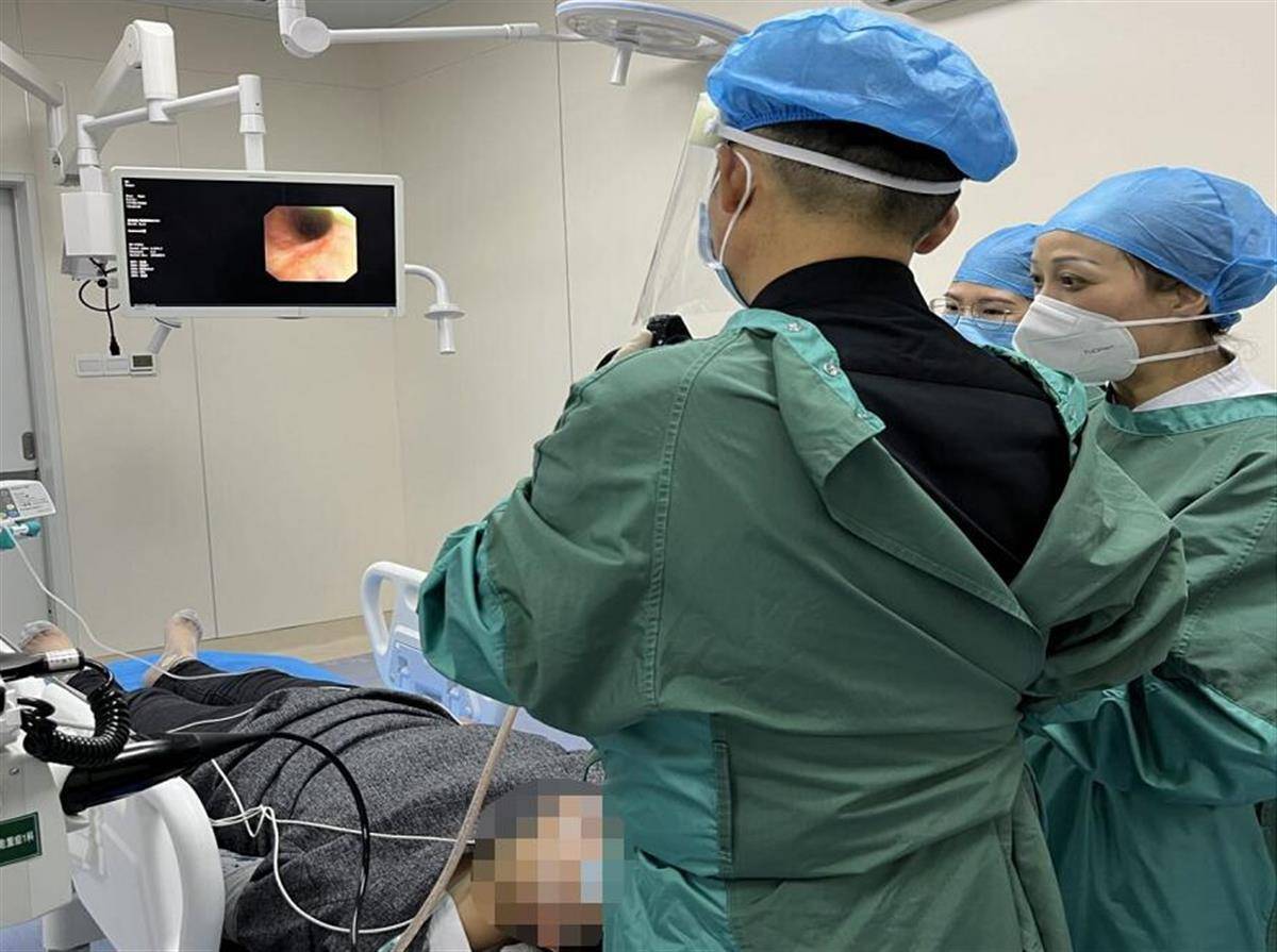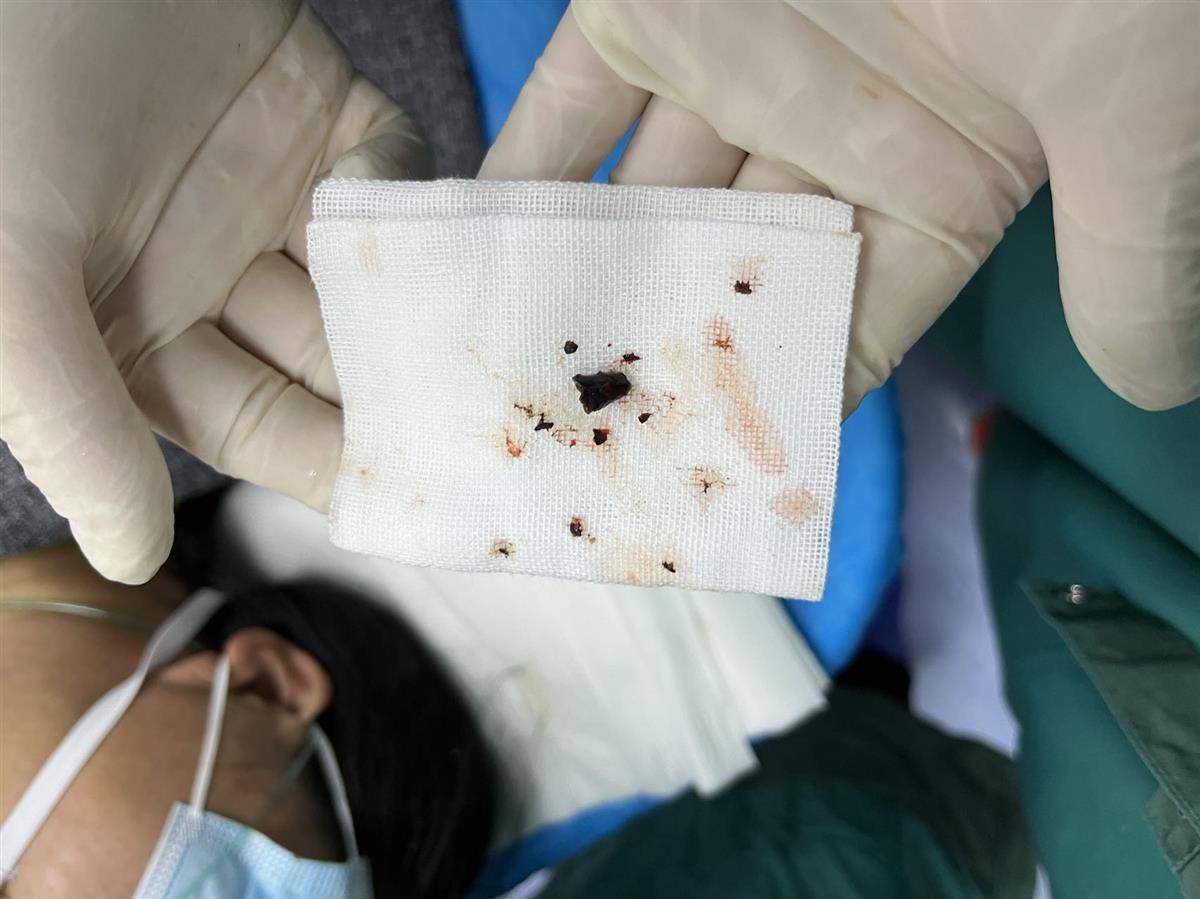 随后,科室主任何家富带领团队利用负压吸引,成功将异物从管腔里吸出。两个多小时后,异物露出了“庐山真面目”,原是一块辣椒皮。
