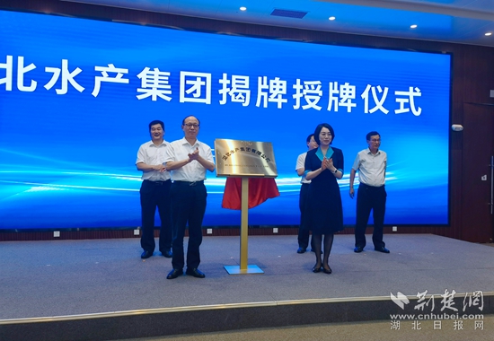 鄂州市委副书记、市长陈平(前排右侧),农发集团党委副书记、总经理陈华志(前排左侧)为湖北水产集团揭牌。通讯员 供图