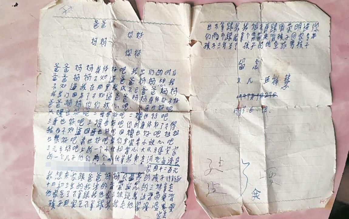 “爸爸妈妈,身体好吧。我出门的时候,爸爸妈妈不知道。你们想我,也不知道我在哪儿。我出门四年了,不知道爸爸妈妈身体好不好,大哥也好吧,大嫂也好吧,二哥也好吧,二嫂也好吧……两个男的把我拐卖到了河北唐山滦县的郭家,卖了4200块。我想回家!想和爸爸妈妈见面!”