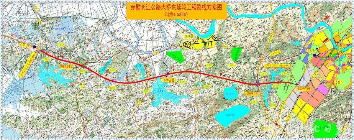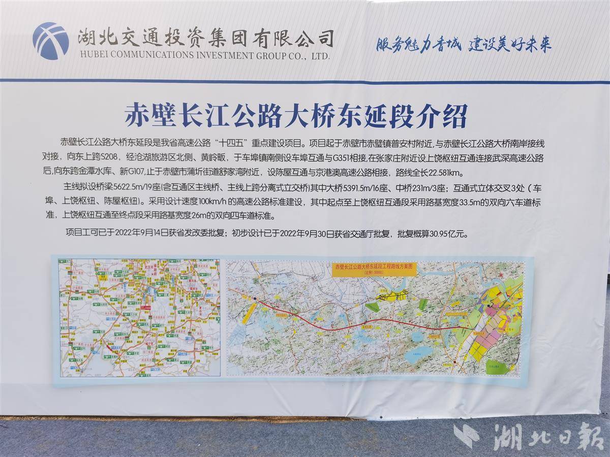 赤壁长江公路大桥东延段项目起于赤壁市赤壁镇普安村附近,与赤壁长江公路大桥南岸接线终点对接,往东南布线,止于蒲圻街道舒家湾附近,全长约22.6公里,共设桥梁19座,其中大桥16座,中桥3座;设互通式立交3处,分别对接351国道、武深高速、京港澳高速。设计时速100公里,起点至上饶枢纽互通双向六车道,余下路段双向四车道。计划总投资33.46亿元,建设工期36个月。
