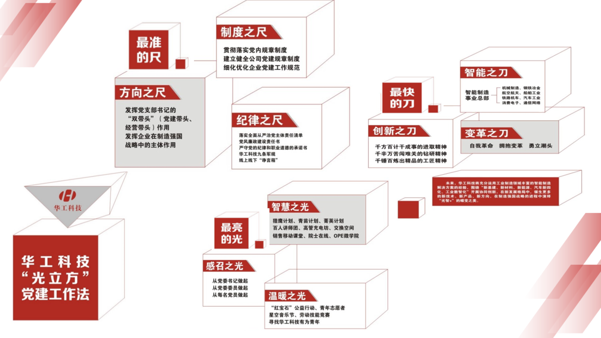 从诞生之日起,华工科技就自带“激光”体质。结合激光“最准的尺”“最亮的光”“最快的刀”三大特性,公司党委提炼出具有特色的“光立方”党建工作法,即:以组织为基石,以制度为纲目,打造“最准的尺”;以党员为先锋,以人才为引擎,打造“最亮的光”;以创新为核心,以开放为支点,打造“最快的刀”。
