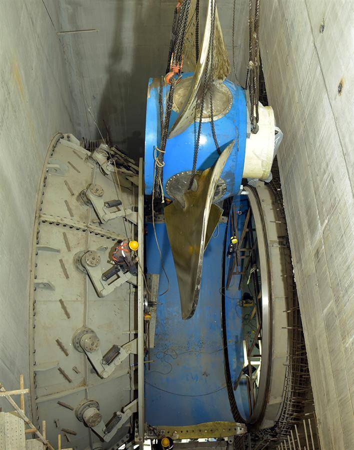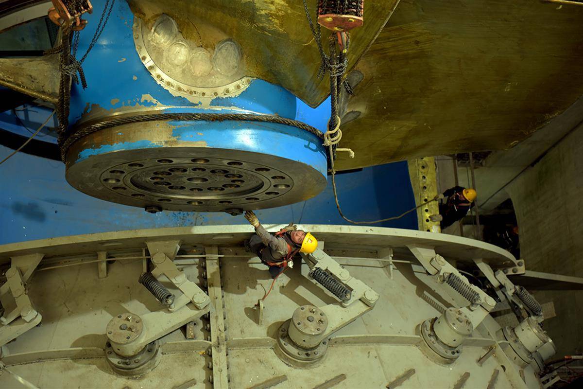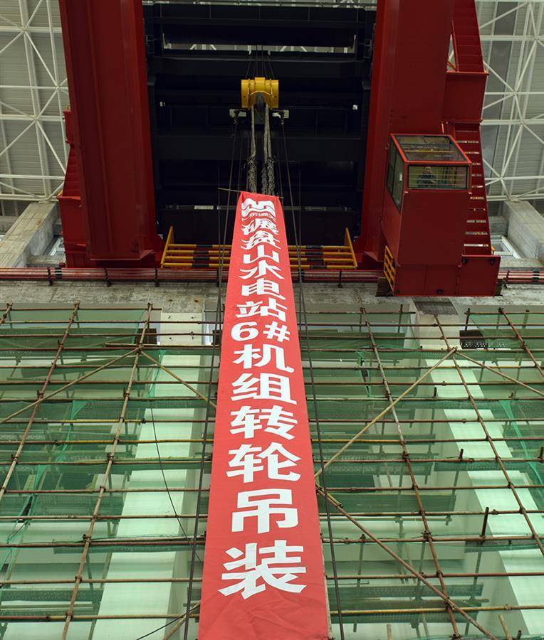 从起吊处到机坑20多米距离,转轮体缓缓“飞行”十几分钟后,对正机坑上方垂直落下……仿佛足球入网顿时欢声雷动一般,现场一片掌声。