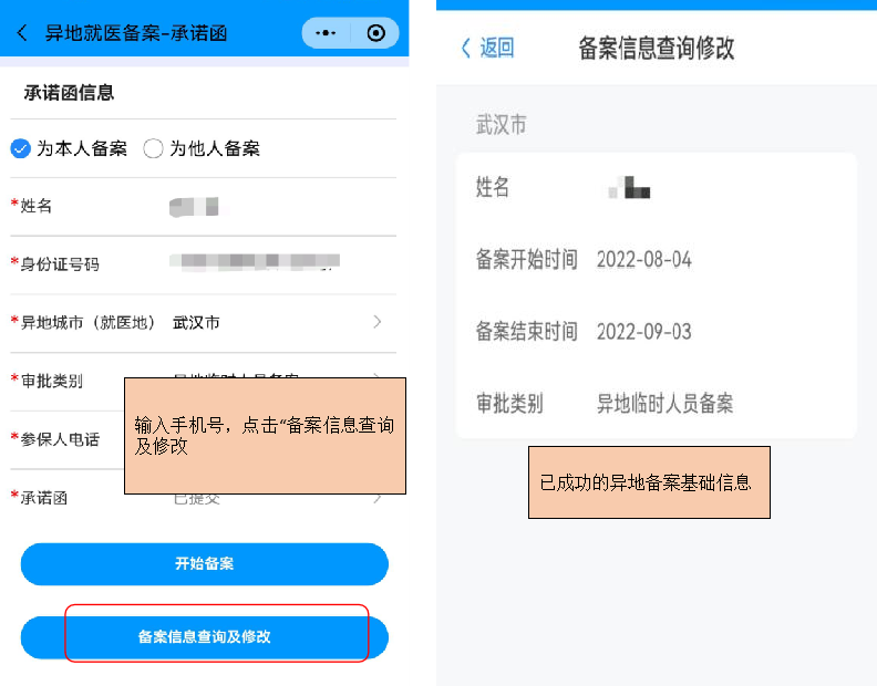 备案成功后,在个人基本信息页输入手机号后点击“备案信息查询及修改”按钮,显示已提交的异地备案基础信息。