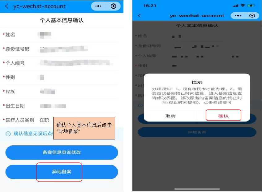 4、确认个人基本信息后点击“异地备案”。