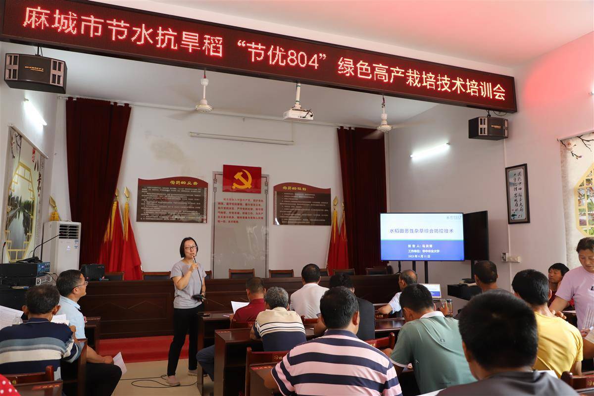 “田地要进行两次耕整,播种前达到细、实、平;在6月15日前及时播种,每亩播种量3公斤左右,播种前种子用多菌灵浸泡10个小时……”黄冈市农科院李兴华开展了“节优804”旱播旱管技术专题培训。
