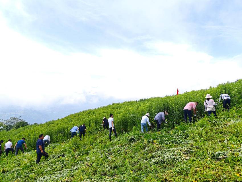 在艾草种植基地里,七、八十号劳动力戴着草帽挥动镰刀收割着已经成熟的艾草。伴随着“唰唰”的收割声,一棵棵笔直的艾草被收割晾晒,一幅田园丰收图景跃然纸上。