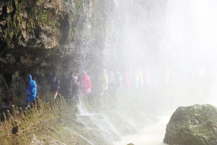 湖北日报全媒记者跟随游客走进穿瀑廊道,头顶是从百余米高的陡峭山崖飞流直下的溪流,内部恰似水帘洞,最宽处近3米。整个廊道长近百米,呈弧形。行走在廊道,犹如置身暴风雨中,狂风夹着水流扑面而来,身穿雨衣也难免湿身。即便如此,许多游客仍会选择往返数次。更有人为了尽兴,脱去雨衣,来一个透心凉。