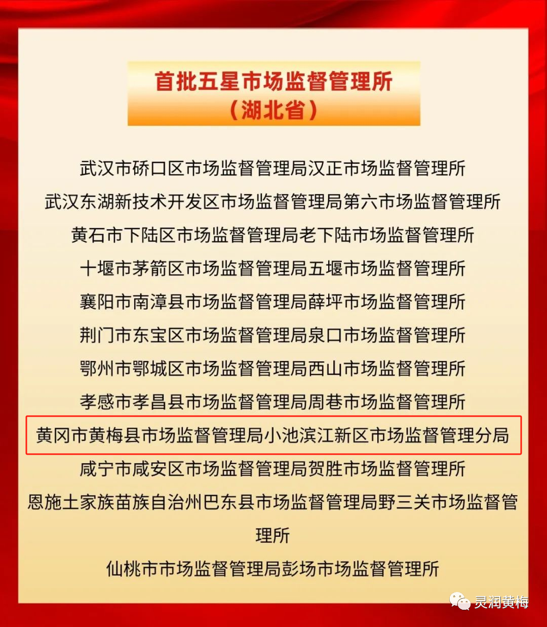 湖北日报客户端讯(通讯员宋涛)近日,市场监管总局公布首批五星市场监管所名单,黄冈市黄梅县市场监督管理局小池滨江新区市场监督管理分局作为全市唯一的一家单位位列其中,成为全国312个首批获评五星市场监督管理所之一。