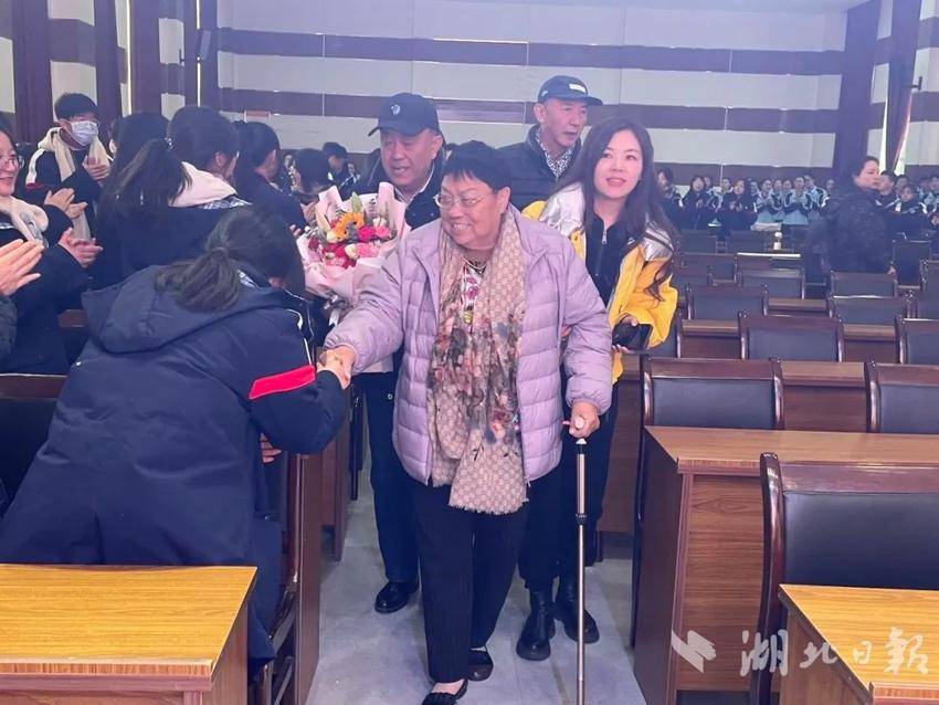 贺炳炎将军后人的到来受到该校学生的热情迎接,将军之女贺北生与学生亲切握手。