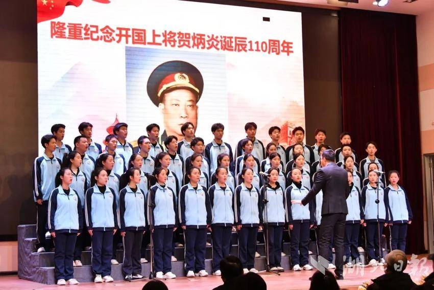该校学生为贺炳炎将军后人献怀念贺炳炎将军的诗朗诵《在将军的故乡凝望》及合唱节目《你的光辉耀中华》。