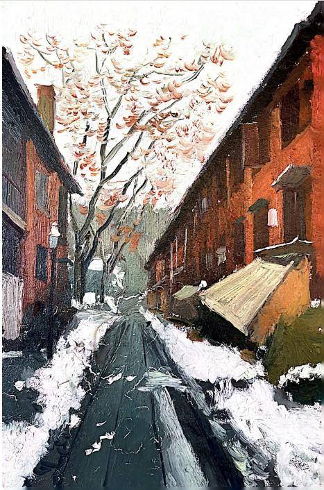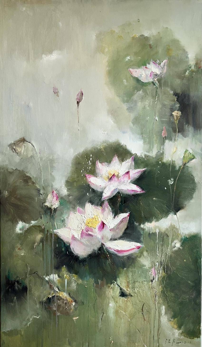 莲,花之君子者也,何为清廉,应是《青莲》。《青莲》是一幅写意油画作品,雨中莲花冲出重重的淤泥和深水,生机盎然,肆意绽放,不染纤尘,与翠绿的荷叶交相辉映,展现出生命的执着和不屈。看取莲花净,应知不染心。