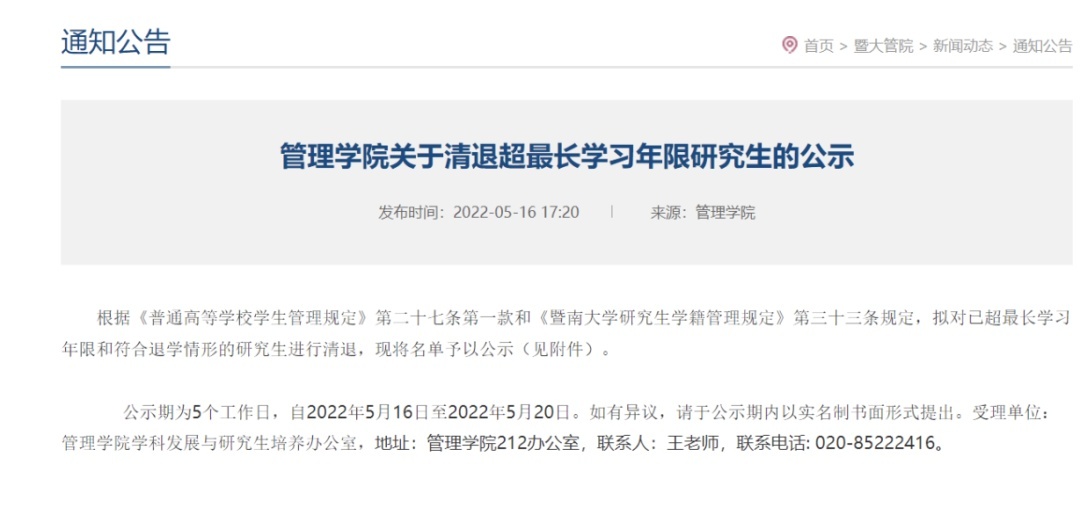 2022年5月,暨南大学管理学院发布公告,拟退学处理研究生37人。其中包括硕士及博士研究生,清退原因多为“已超最长学习年限”。