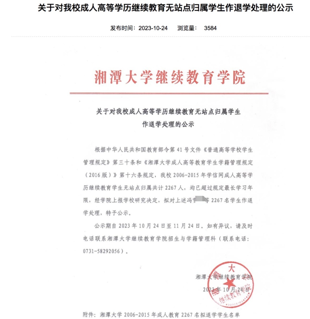 网传文件截图显示,截至2023年10月,2263名学生在学校规定的学习年限内未达到毕(结)业条件。“根据《普通高等学校学生管理规定》及《湘潭大学成人高等教育学生学籍管理规定》,经学校研究,决定对上述二千二百六十三名学生作退学处理”。