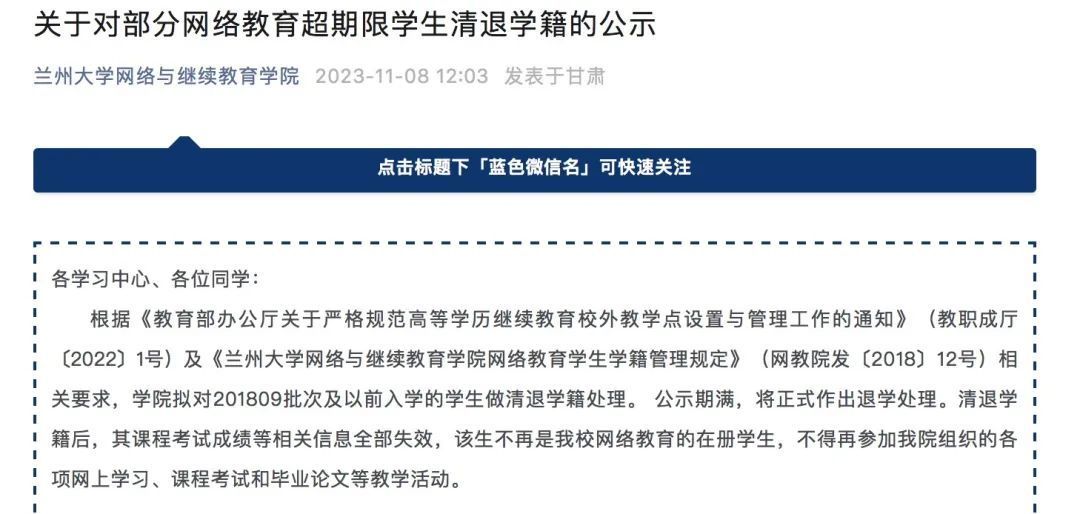今年11月,兰州大学网络与继续教育学院发文,学院拟对201809批次及以前入学的学生做清退学籍处理。公示期满,将正式作出退学处理。