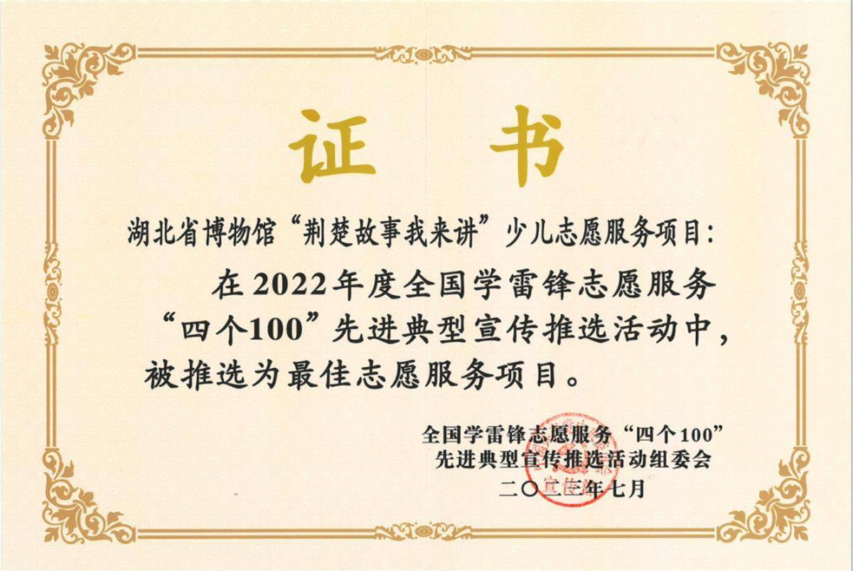 7月30日,湖北省博物馆“荆楚故事我来讲”少儿志愿服务项目经国家文物局推荐,获评2022年度全国学雷锋志愿服务“四个100”先进典型之“最佳志愿服务项目”。