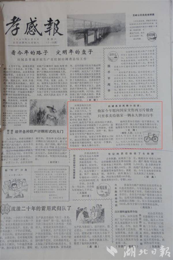孝感报1981-9-5《应城县农民杨小运说:他家今年愿向国家交售两万斤粮食 只要求卖给他家一辆永久牌自行车》