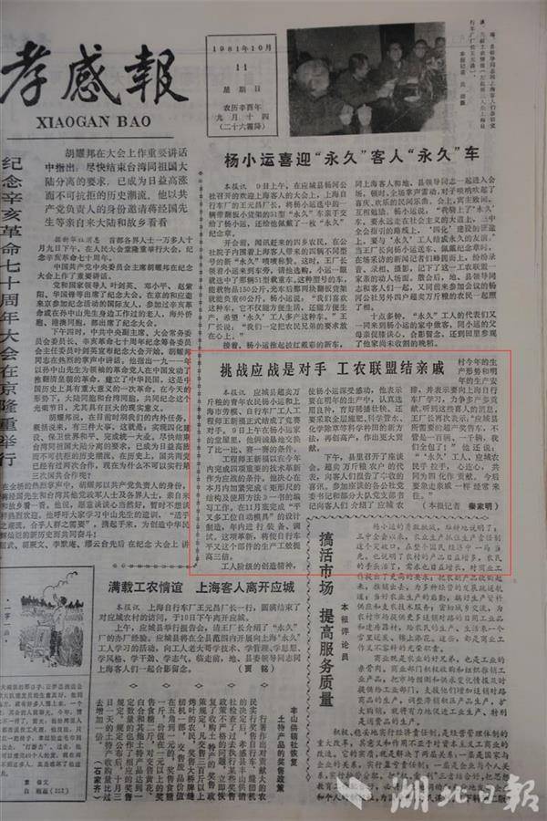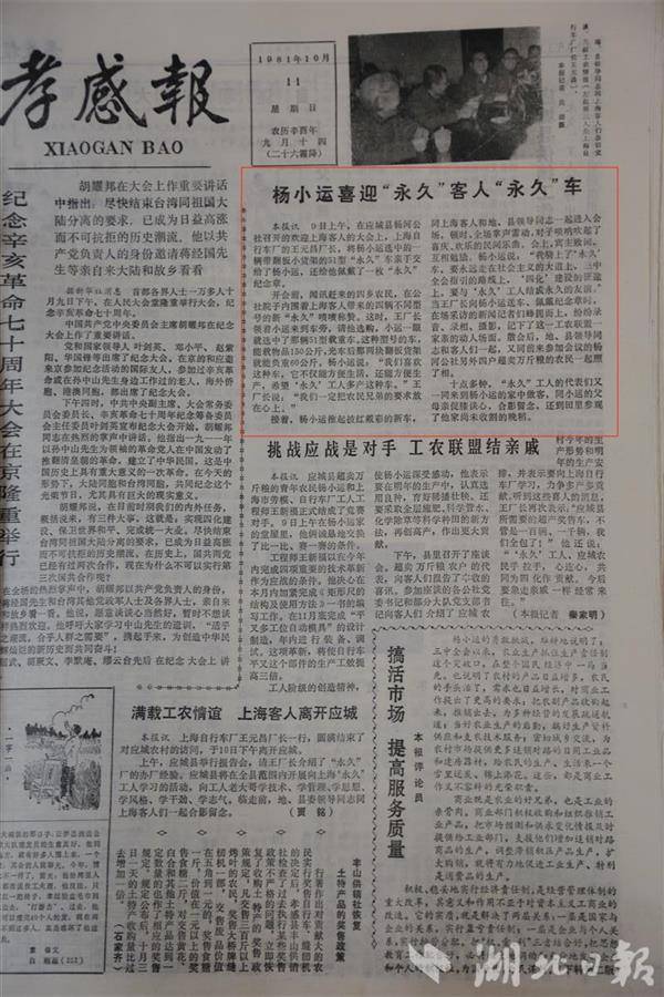 孝感报1981-10-11《杨小运喜迎“永久”客人“永久”车》