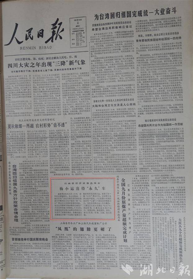 人民日报1981-10-3《应城县召开奖售兑现会 杨小运喜得“永久”车》