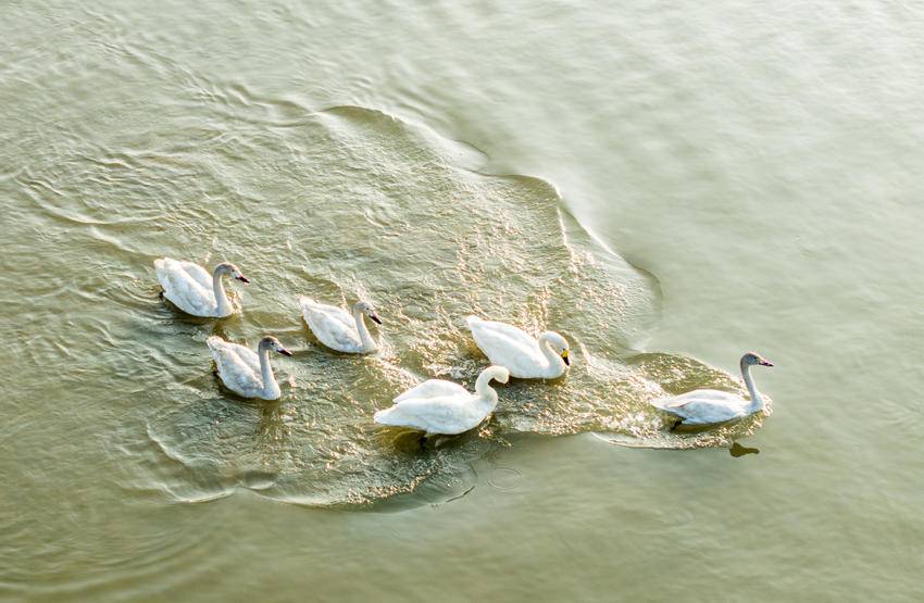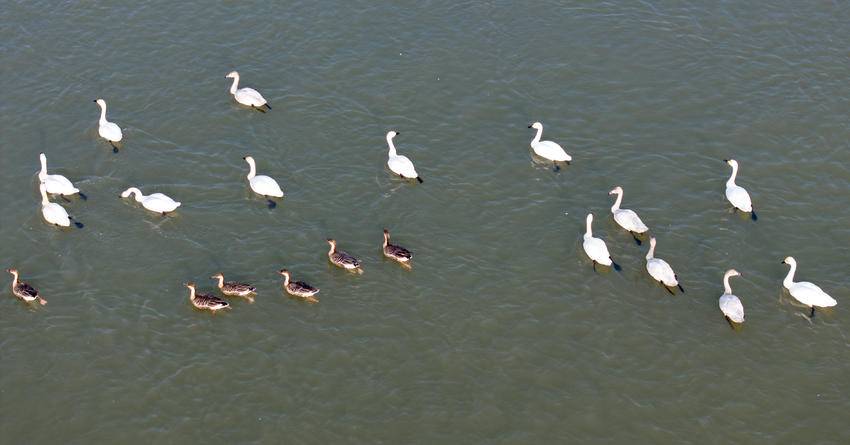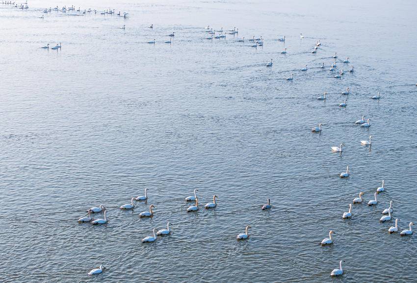 1月1日下午,上千只天鹅、鸳鸯、野鸭栖息在鄂州市华容区长江洲尾水域,在新年第一天展示了人类与动物和谐共处一幅美丽的画面。一艘艘轮船在开阔的水面上划过,避开在长江中间成群结队嬉戏的天鹅、鸳鸯和野鸭,激起层层金色的波纹,展现出生态之美、文明之美。