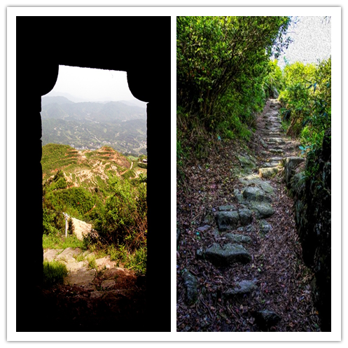 ▲左图:张师山完整的寨门丨右图:上山顶的石板小道