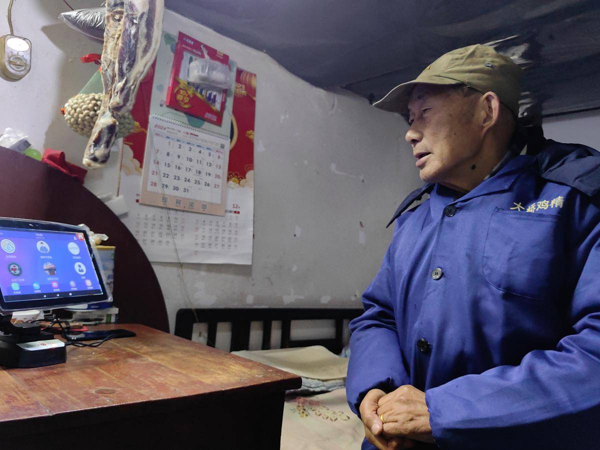 1月18日上午,武汉市江汉区高家台社区72岁的失能老人鲁润香家中,馨美宇养老服务站的中级养老护理员朱锋和万焱智正为鲁润香量血压、测血氧等。
