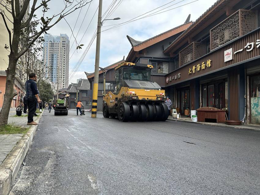 湖北日报客户端讯(通讯员汪璇)4月8日,在鄂州吴都古肆南街,中国一冶施工作业人员正在对路面进行刷黑焕新工作。