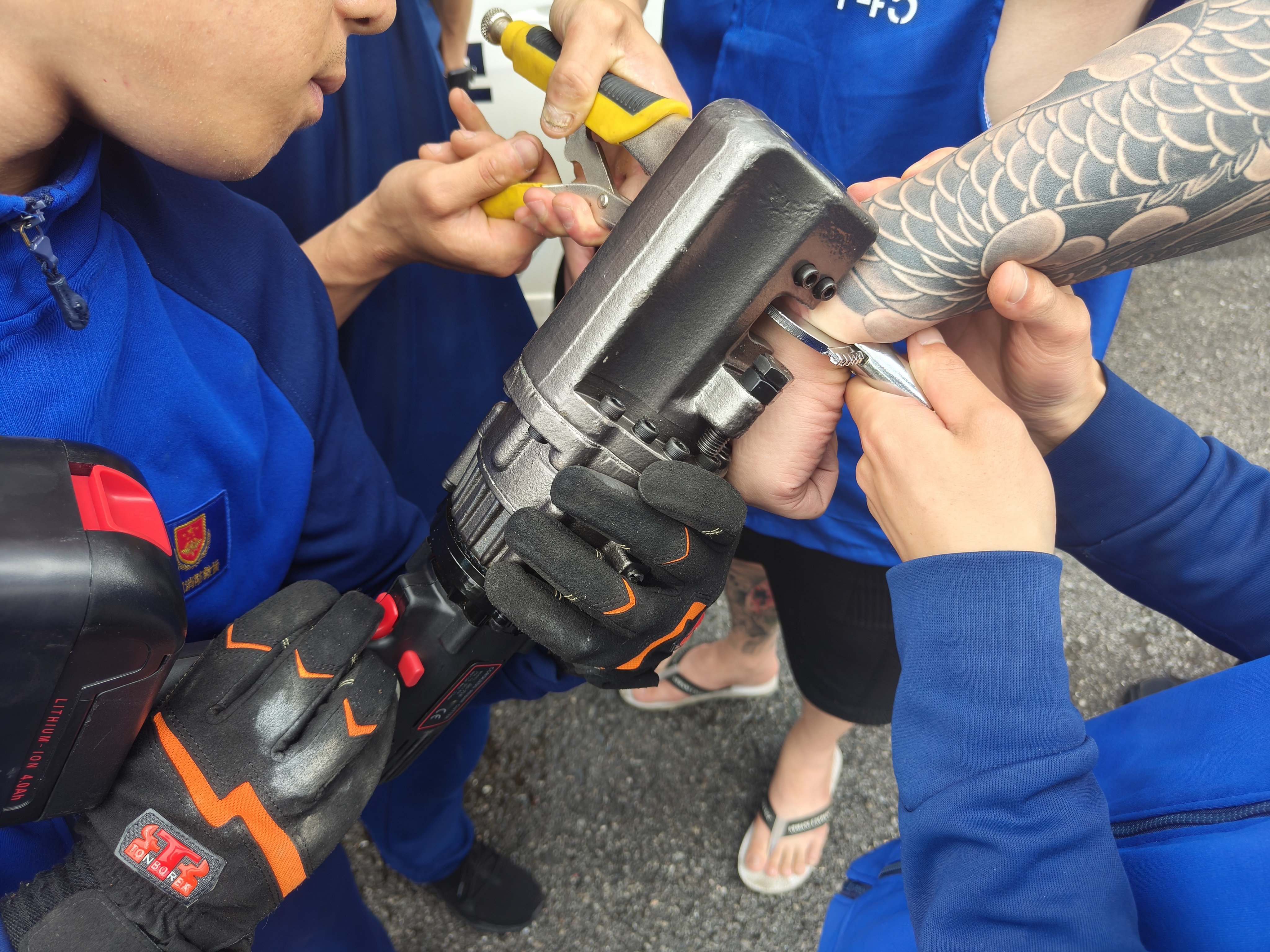为了防止操作过程对嫌疑人造成二次伤害,消防员利用大力钳固定手铐避免晃动,另一名消防员利用钢筋速断器对准手铐循序渐进的方式对手铐进行剪切。1分钟不到,手铐被成功摘除。
