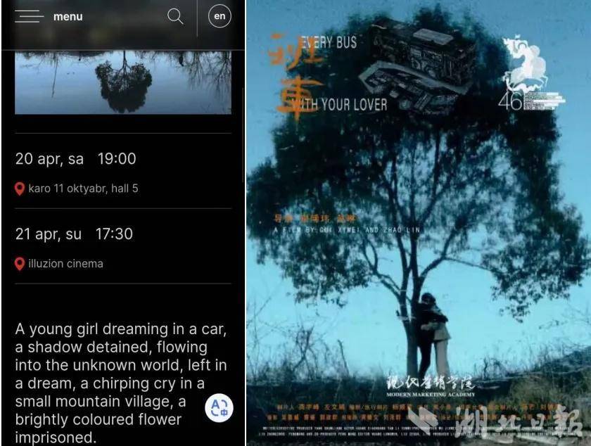 莫斯科国际电影节创办于1959年,由莫斯科联邦国家文化部主办,是世界上历史第二悠久的国际电影节,也是俄罗斯最大的国际电影节、世界最重要的国际电影节之一。第46届莫斯科国际电影节,于4月19日至26日在俄罗斯首都莫斯科举办,《班车》于20日在莫斯科“十月”电影院展映。