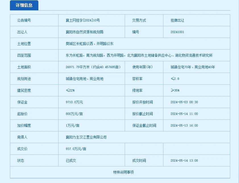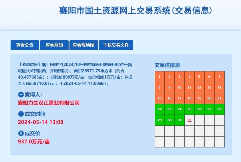 湖北日报客户端讯(通讯员徐琦)5月14日中午,历经134轮激烈竞拍,最终,襄阳力生汉江置业有限公司以报价 937万元/亩(折合楼面地价 5020元/㎡),成功竞得一宗位于樊城区,面积为26971.79平方米(约合40.457685亩,襄土网挂字[2024]10号,城镇住宅、商业用地)国有建设用地使用权,预计成交价款3.79亿元。