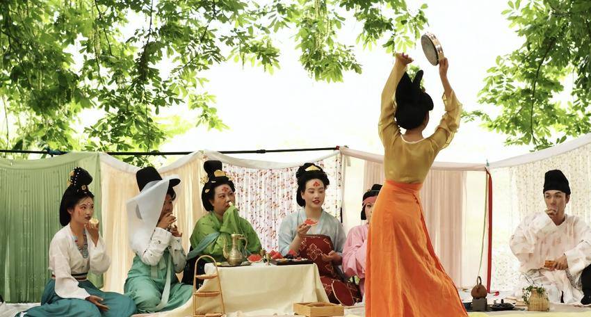 “雲夢澤”汉文化社社长吴诗维告诉记者,隋唐时期,文人墨客都爱踏春出行,遇到好的景致,便会“铺席藉草,围坐一圈”,而大唐女孩们野餐的“裙幄宴”,便是唐代开元至天宝年间仕女们经常举办的野外聚餐活动。