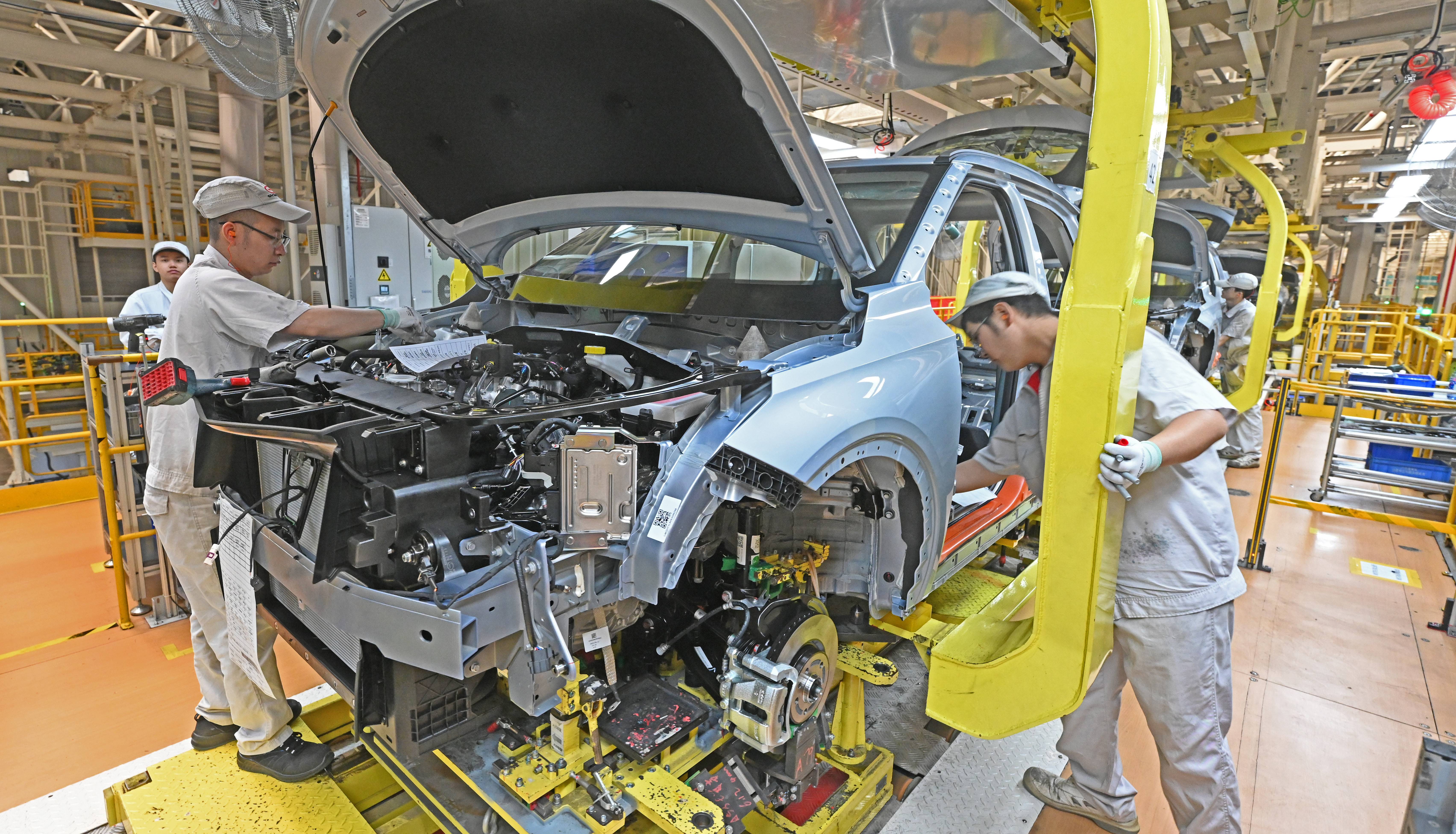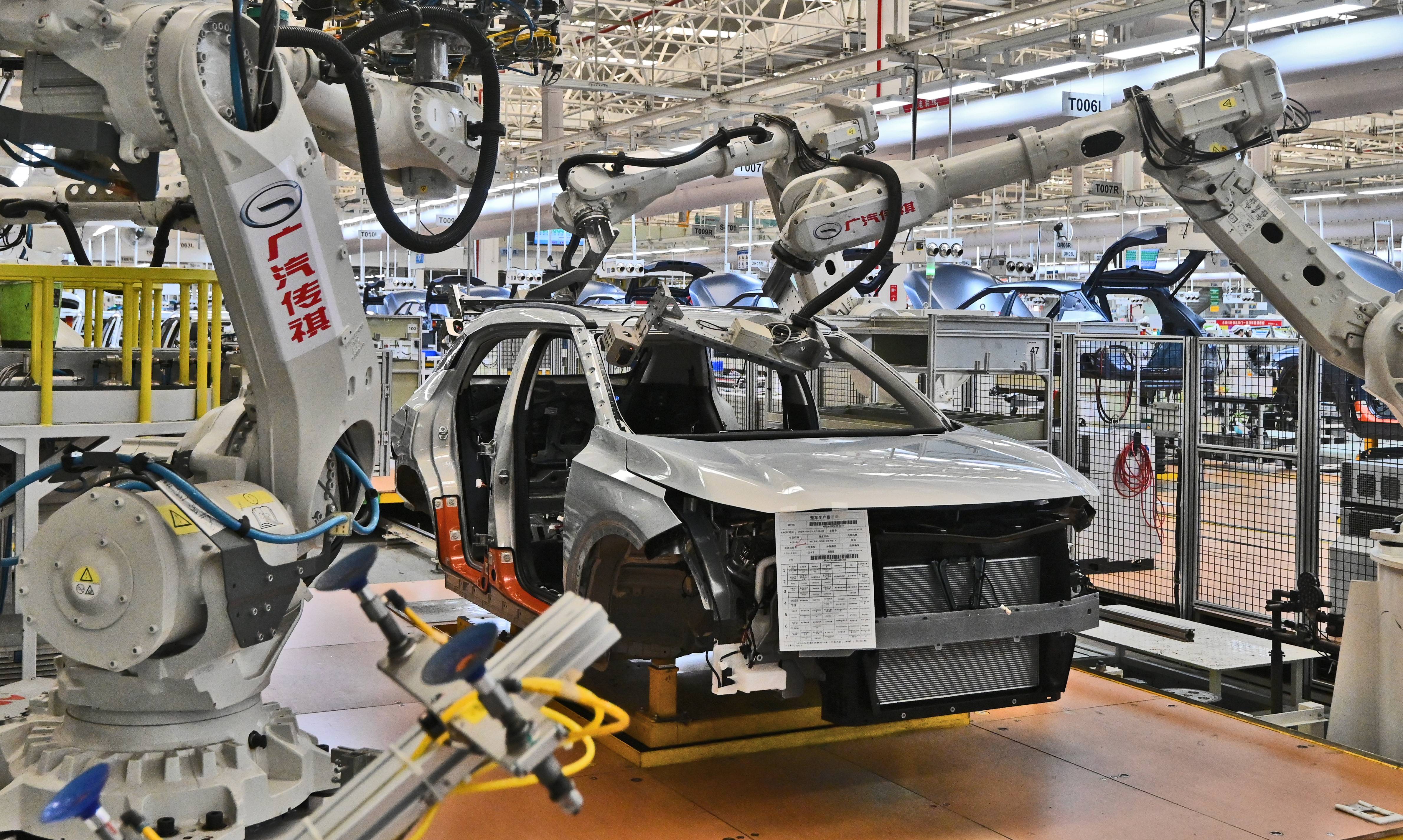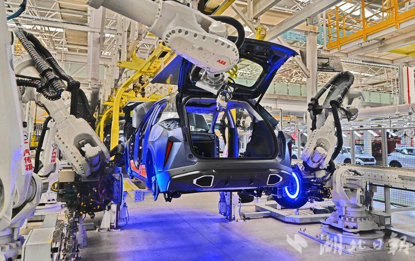 6月3日,广汽传祺宜昌工厂总装车间自动化生产线上,机械手上下翻飞,每天有400台崭新的汽车从这里下线。今年1-5月,该企业累计实现产销量4.5万辆,同比增幅超过30%。目前,广汽传祺宜昌基地产销两旺,5月第30万台新车已经下线,在巩固传统产品的基础上,正布局传祺智电新能源产品,后续将加快推出宜昌地产新能源车。(湖北日报全媒记者 刘曙松 通讯员 谭雪姣 摄)