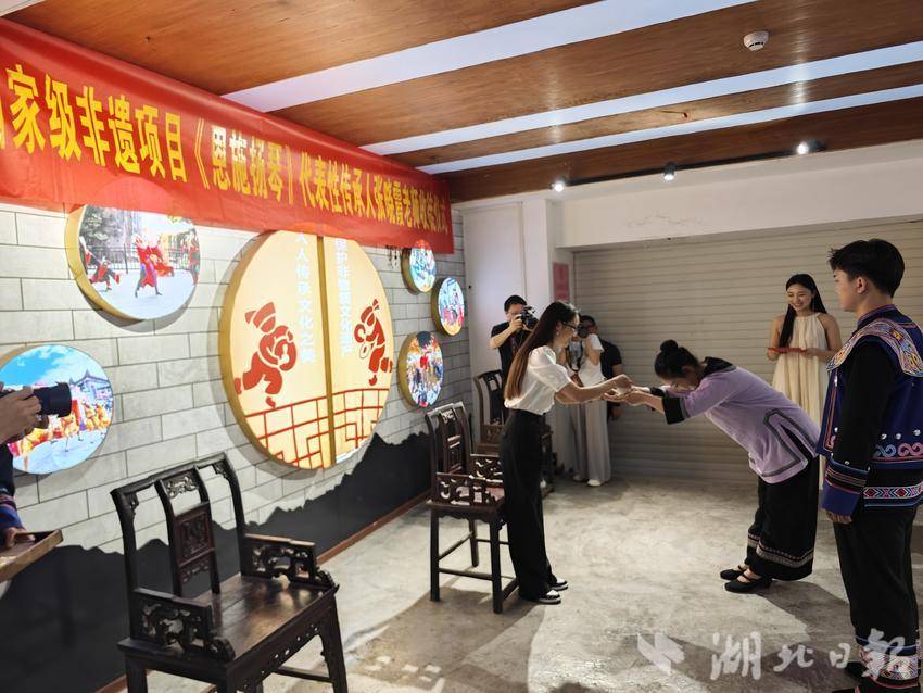 《鹤峰柳子戏》省级代表性传承人肖宗祥、《五句子山歌》州级代表性传承人许艺才、《巴东堂戏》州级代表性传承人谭文署、扬琴老师徐常明和市非遗保护传承展演中心相关负责人及市民游客等共同到场祝贺见证。张晓霞收下拜师帖,并予以回帖寄语。至此,“国”字号非遗项目有了新生代传承人。