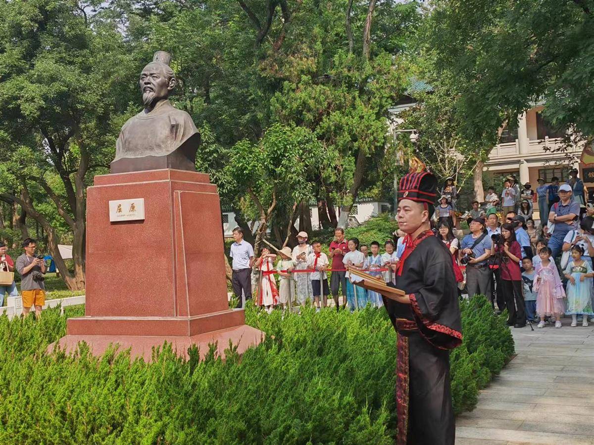上午9时,35名身着楚服的汉服爱好者齐聚屈原纪念馆前,以华夏礼乐仪式纪念伟大爱国诗人屈原。“吾辈当以屈子为范,守正道而前行,怀赤诚而报国,继往开来,共谱华章。”在屈原雕塑前,湖北省话剧院国家一级演员、81岁老戏骨李贻清通过朗诵纪念屈原,他饱含深情的语调,将屈原的爱国情怀和壮志未酬的遗憾表达得淋漓尽致。