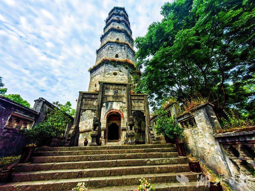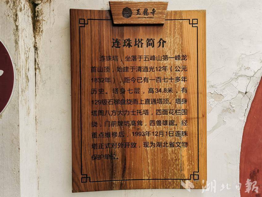 连珠塔位于恩施市五峰山主峰龙首山顶,始建于清道光十二年(公元1832年),距今已有一百九十多年历史。塔身共有七层,高34.8米,共有129级石梯盘旋而上直通塔顶。塔身四周八方大力士托塔,四面花栏围绕,门前牌坊高耸,四兽雄踞。