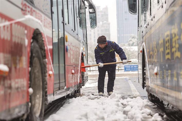 2024年2月4日,正值春运高峰,冰雪来袭,武汉公交集团533路汉口火车站公交站台上,工作人员在车内台阶和站台撒盐、铺放防滑垫,同时还加密雨刮、轮胎、方向等车辆机件检查频次,全力保障市民安全出行。