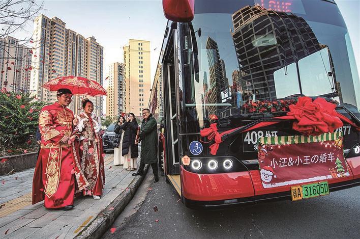 2023年12月24日,武汉市新洲区某酒店门口,新郎汪泽琦和新娘王泽雯登上“公交定制婚车”。