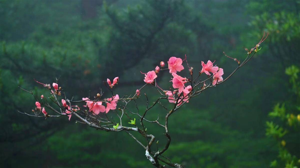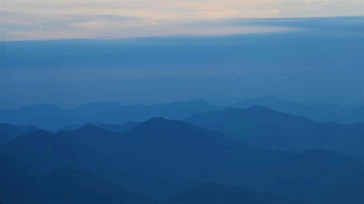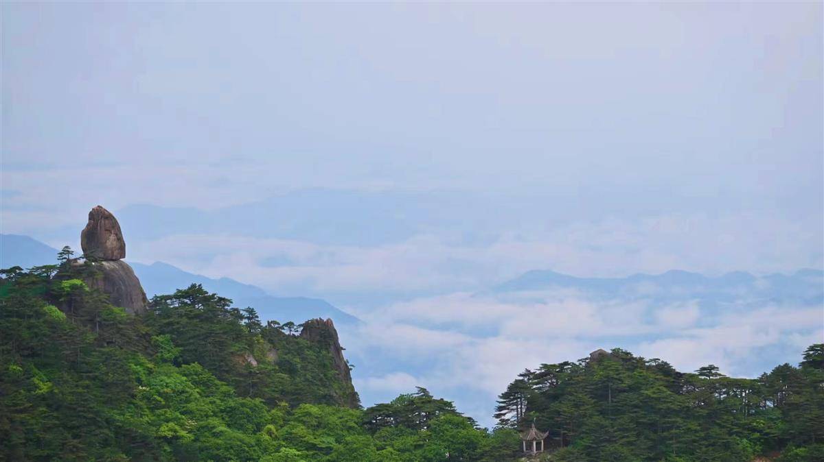 奇巧险峻的黄山在雨中变成了一幅立体的水墨画,山石间充盈的云雾随风缥缈,是工笔水墨的留白,像一层白纱遮蔽了山体和远处的视野。山风吹过,水雾随风扬起,犹如飞踏的骏马,如庄子所言的“野马也,尘埃也,生物之以息相吹也”。雾气蒸腾与充盈只在倏忽之间,好似有无形的大手在绘制大写意的江山图,还是工笔的。从光明顶下来的过程中,可见远处的叠嶂的山峦间云雾流溢,原本不少深夜露营于此等待日出的游客驻足欣赏起了云海,算是柳暗花明又一村。