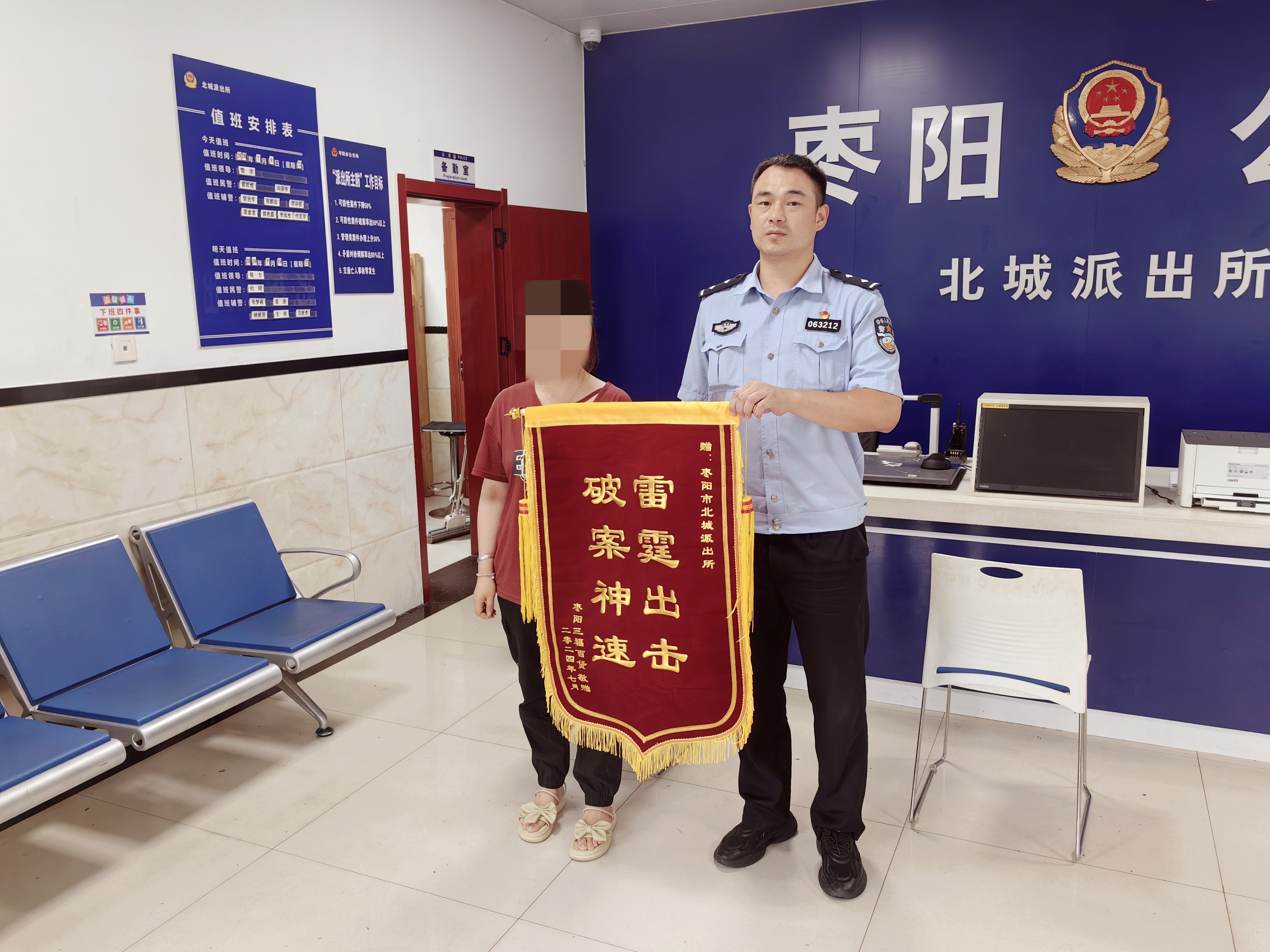 7月16日下午,某商铺店员将一面印有“雷霆出击,破案神速”的锦旗送到了枣阳市公安局北城派出所民警手中,表达对民警的感谢之情。