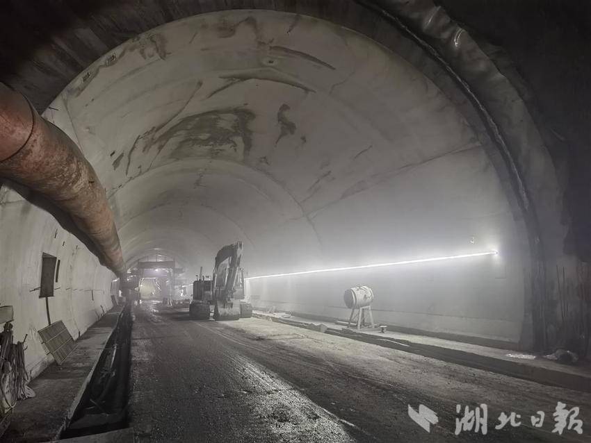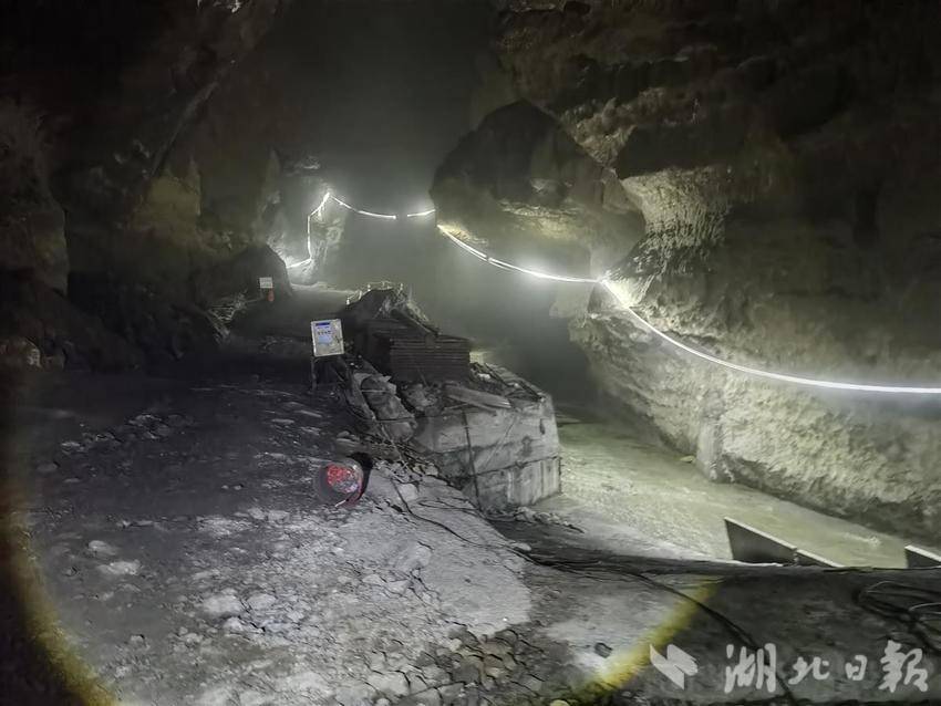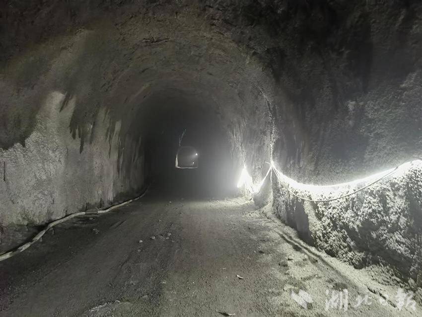 沿着蜿蜒的国道蛇形爬升,在武陵山区一路向南1个多小时,来到渔洋关镇南河村,左右各出现一个大隧道。这是呼北高速宜都(全福河)至鄂湘界段麒麟观隧道,全长8215米,是湖北罕见的特长隧道之一。隧址区为构造剥蚀溶蚀侵蚀低山地貌,岩层构造复杂,存在溶洞、涌水突泥等不良地质。大溶洞,就在隧道里。