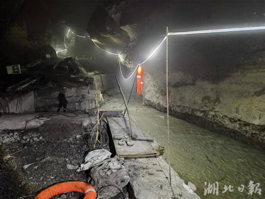 找到“病因”,参建各方共同开出“药方”——疏堵结合做手术。一方面,通过新挖检修洞,使得大型设备、人员进入溶洞,在河流上方修筑拦水坝。另一方面,重新清理河道,河床铺设50厘米厚的钢筋混凝土,牢牢“锁住”渗水。建设者还采用科技手段,实时监测溶洞暗河变化。