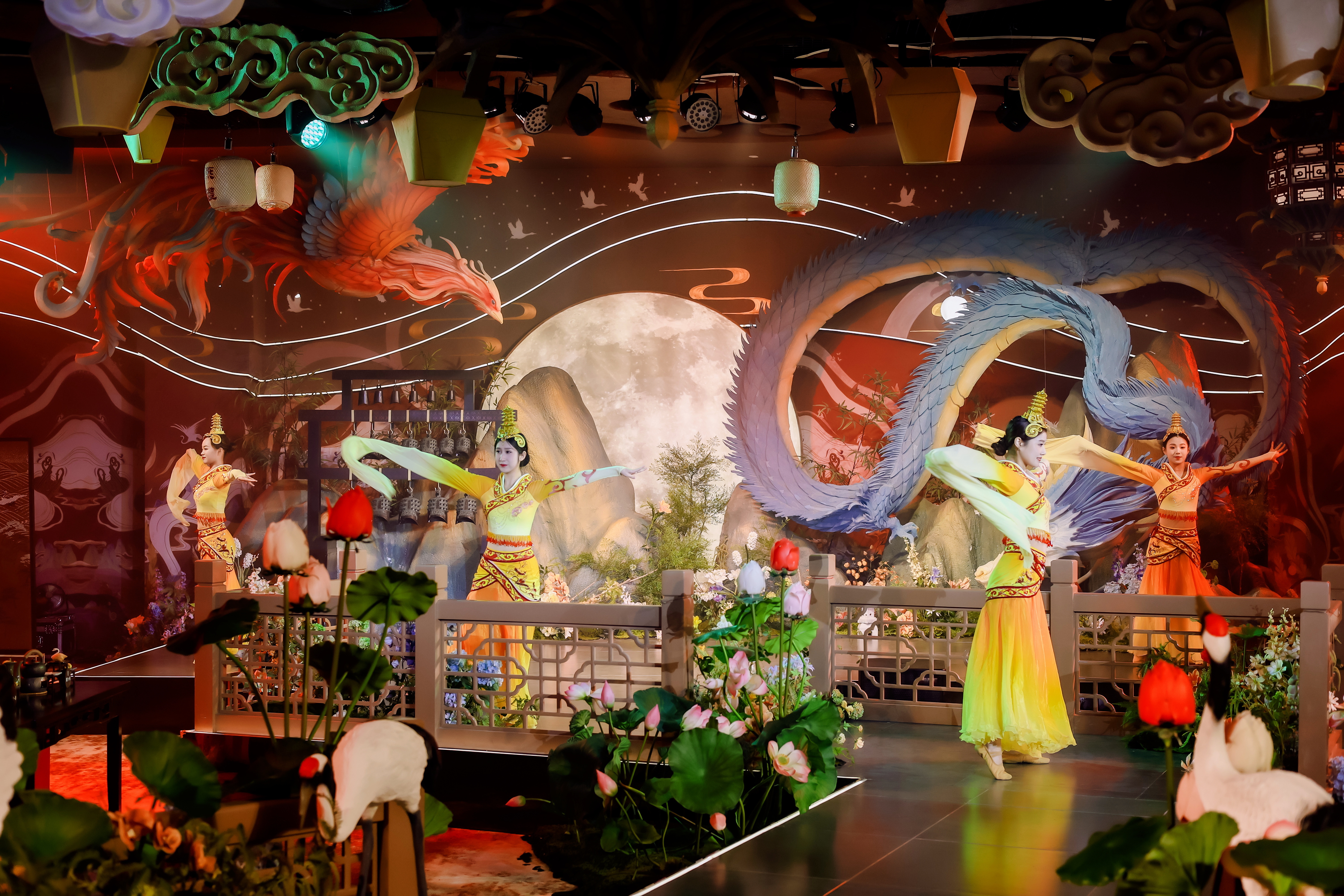 将餐饮与剧场相结合的玩法,湖北已有尝试。鹤舍将东方鹤文化融入餐饮的结构,以宋时四雅“焚香、点茶、挂画、插花”搭配秦式鹤舞,再与精致的创新楚菜相结合,让食客品美食更品文化。华清宴·曲歌舞赋以唐代文化为核心,每个包厢设置不同主题,用餐期间可欣赏唐风歌舞表演。