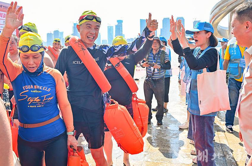 8月8日上午,抵达汉口江滩三阳广场的群众横渡方队队员受到欢迎。