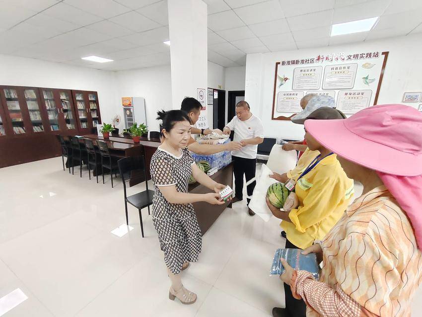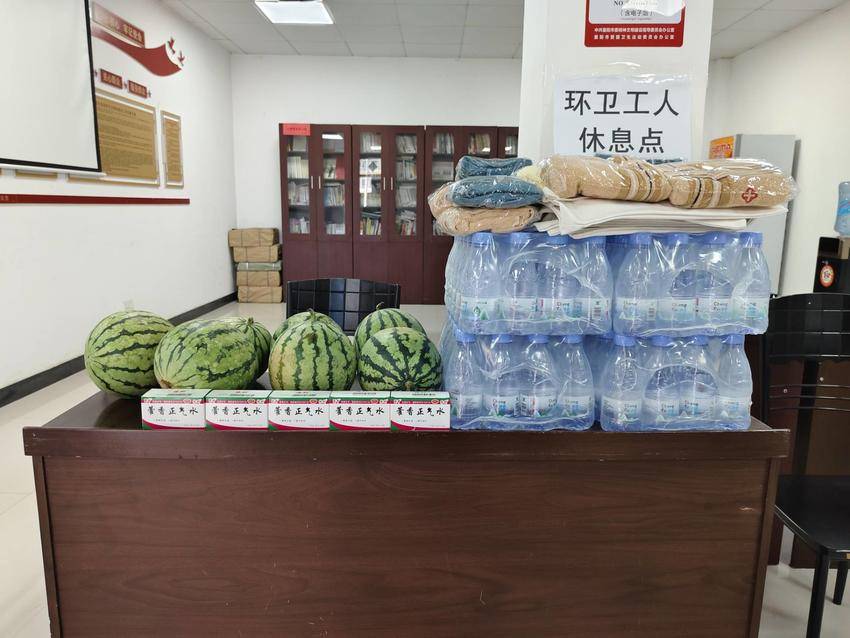 卧龙镇中心卫生院工作人员为环卫工人提供了藿香正气水、矿泉水、西瓜、毛巾、雨伞等清凉物资,并将清凉物资亲手送到环卫工人的手中,同时向环卫工人表达了敬意和感谢,感谢他们为城市的环境卫生作出的贡献。