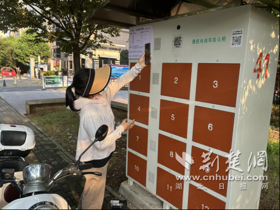 9月3日,笔者在襄城区檀溪街道区营盘社区看到,三排中国铁塔共享充电柜整齐排列,居民黄女士将电动自行车停在小区门口的换电柜旁,手机扫码开柜,将低电量电池放入,再取出一块电池放入自己的电动自行车,整个过程用时不到3分钟,方便快捷。